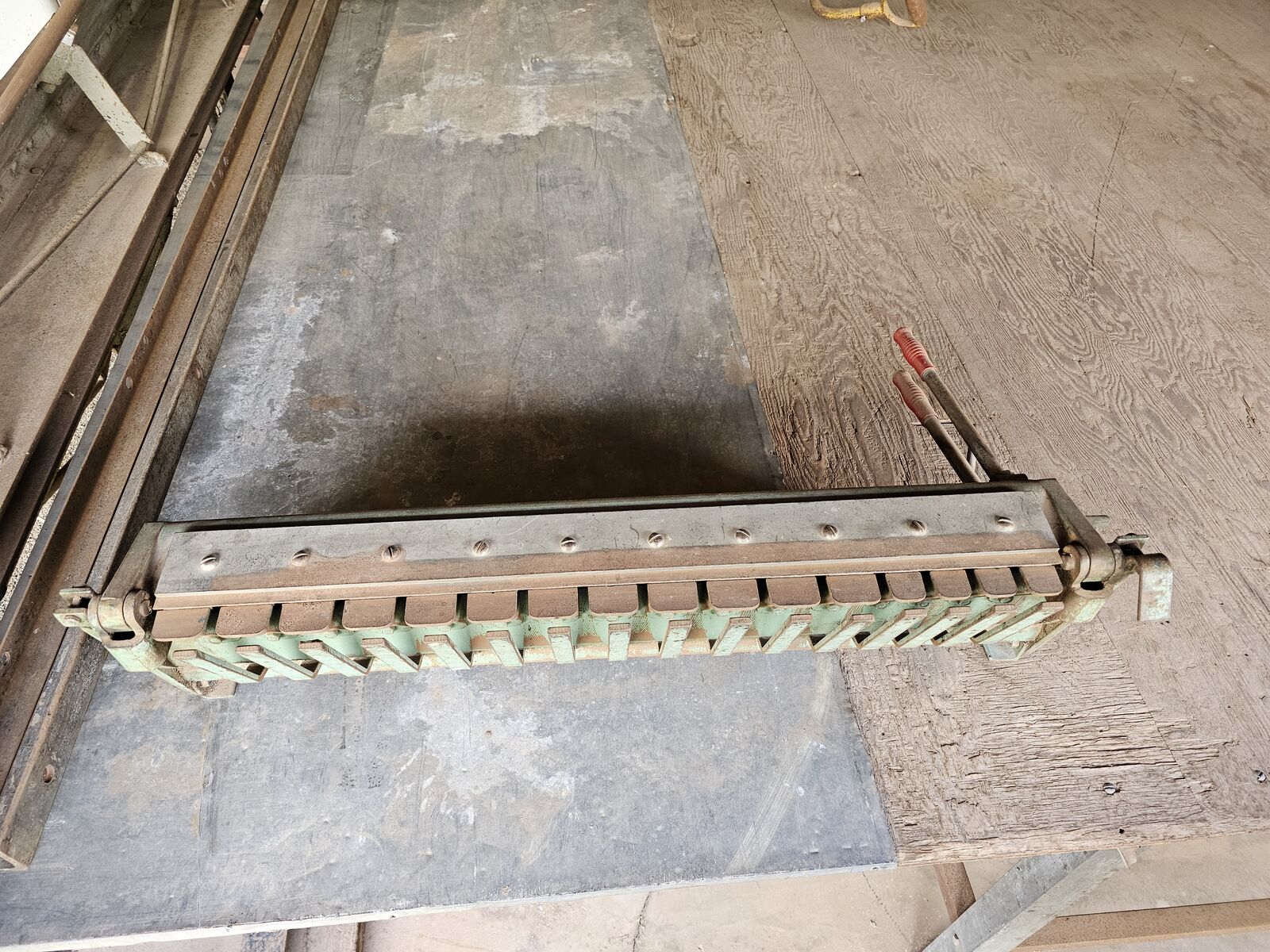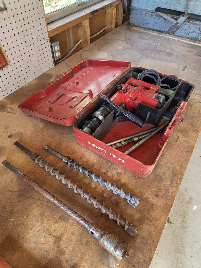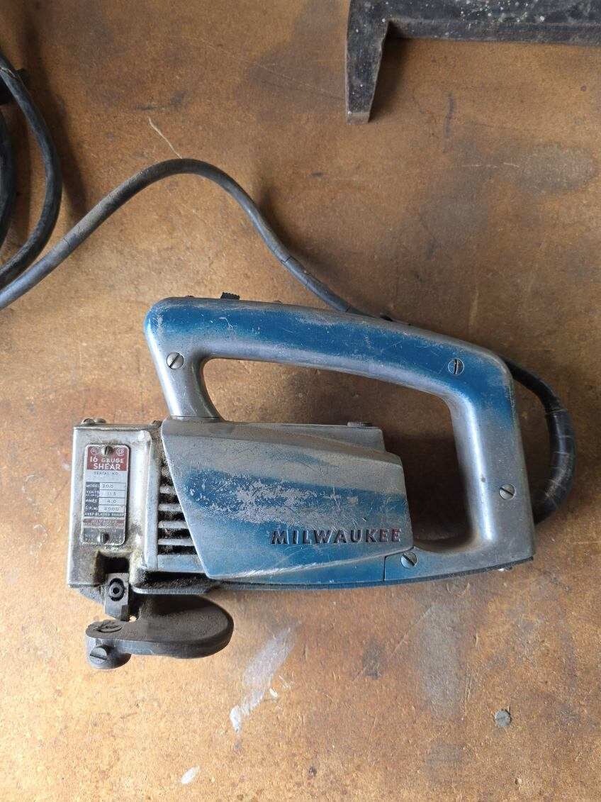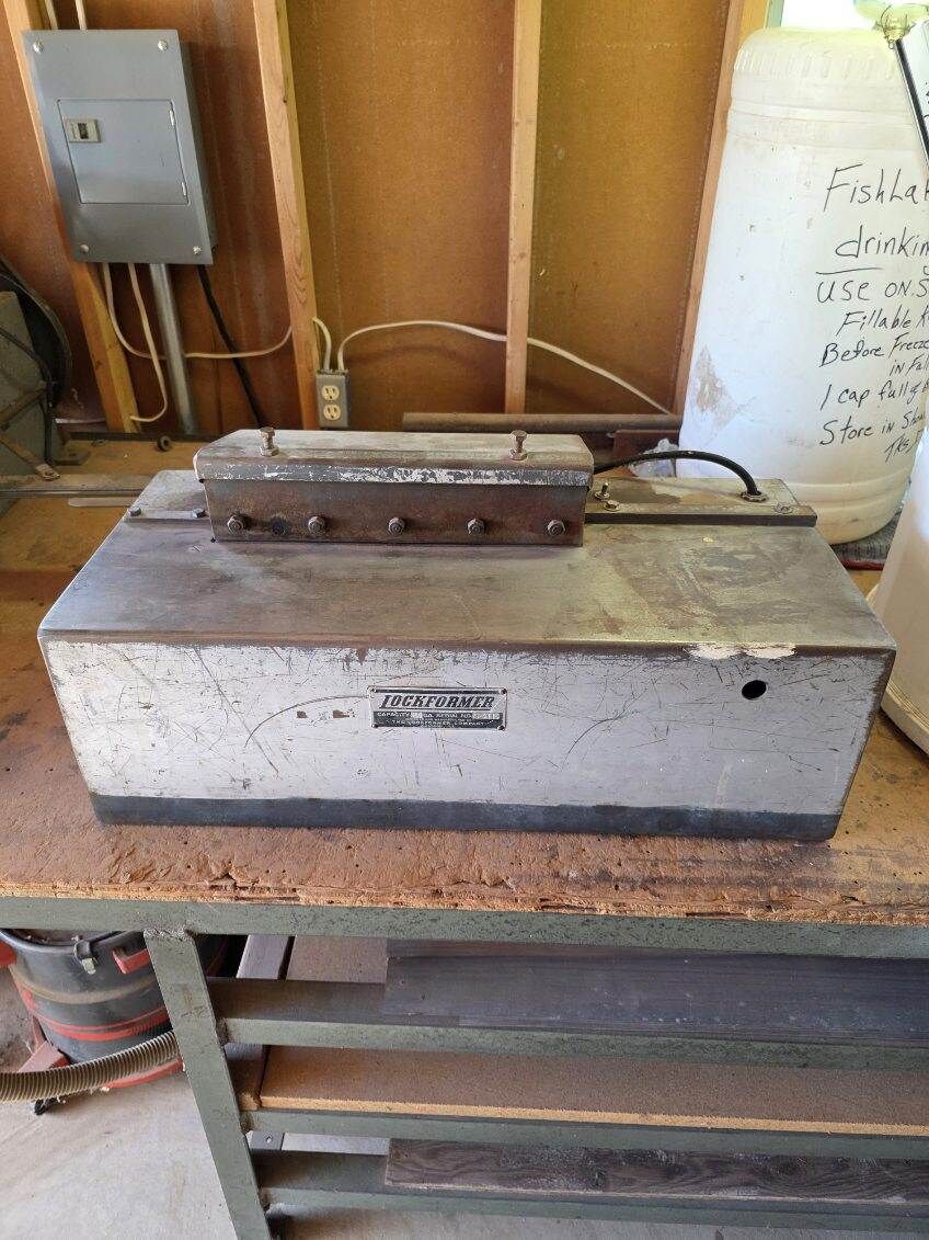 Sheet Metal Shop Equipment for sale. 8' Sheetmetal Brake w/ reinforcing angles, 8'x8' Brake back table, 36" Foot Stomp Shear, Drive/Cleat manual bender, S-Clip Bar Folder, 36" Slip Roller for round pipe shaping, Pittsburg Lock Former Machine, Electric Sheet Metal Slitter, Electric Duct Hammer, Large Sheetmetal Snips, Sheetmetal Storage Work Bench, Gas Pipe Threading Tools, Hilti Hammer Drill.