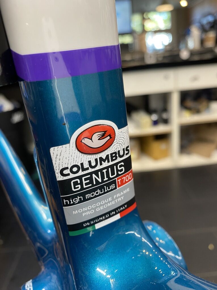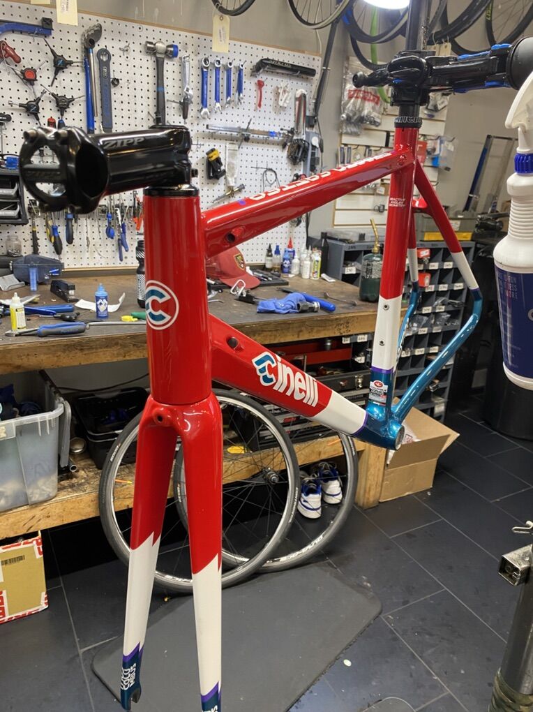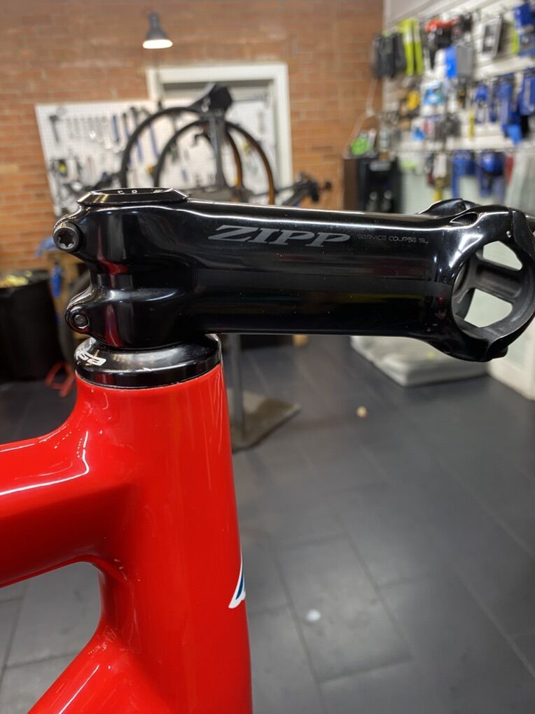 PayPalAwesome frame set! Super quick and stiff -rim brake -54cm center of bb to top of collar -55cm effective top tube -pressfit bb 86.5x41 bb shell -110mm Zipp stem and Deda seatpost included.