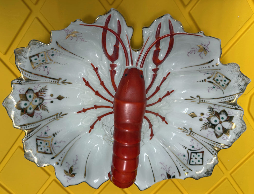 $20. Vintage Lobster Serving Bowl decorated with 24k gold trim. One edge has a broken tip (see photo). Measures approx. 14" x 11". Cash preferred. Pick up only in southwest Orem or American Fork.
