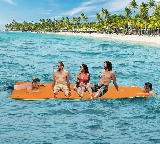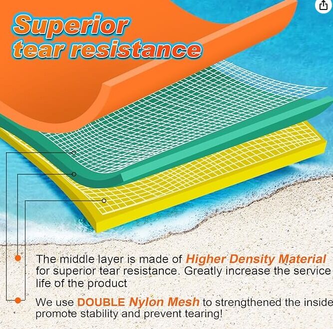 About this item Make This Summer Memorable – Summer is coming! The floating mat is perfect for parties, bringing hours of fun for the whole family and friends on a hot summer day, you can take it to water parks, swimming pools, lakes, beaches and the sea for any water games, enjoying endless memories of fun! SAFETY COMES FIRST: Unlike any other floating mat on the market, our floating mat middle layer is made of Higher Density Material with 2-Layer Nylon Mesh to strengthened the inside to promote stability and prevent tearing. Made of 1.3 inches tear resistant & UV-resistant 3-layer XPE foam, make sure you will enjoy happy summer moment for years to come! Superior Load Bearing Capacity -- With strong buoyancy and load-bearing capacity, our floating pad can support up to 690 lbs. of evenly distributed weight and is suitable for 4-5 adults. We just wish that you could always be happy and stay relaxed! Bright Color for Visibility & Safety – Safety is equally important to fun which is why this eye-catching color floating water mat(Orange-Green-Yellow) is easier to see in high traffic lake areas to swimmers, floaters, and loungers can all be seen near boats or docks. Easy to Roll Up for Carrying & Storage: Our Floating Mat come with 3 EXTENDED storage straps, which are convenient for tightening the mat, after rolling up, it’s convenient to carry and store, you can store it in some limited space and it will not need too much space when it's not in use. Includes Essential Accessories – Each floating water pad mat also comes with a 16.4’ elastic bungee tether to help you safely anchor the mat to a dock or stationary point by the edge of a lake, as well as custom hook-and-loop straps for quick, easy storage. Use Tip 1: After opening the floating mat, please take some time to unfold it or roll in the opposite direction to make the water floating mat level, and then put the lily pad float mat in the water to make it full of buoyancy. This will bring a better user experience! Use Tip 2: The floating mat should be stored in a dry and cool place after using, also please try to avoid direct sunlight, the direct sunlight will cause product FADE colors!
