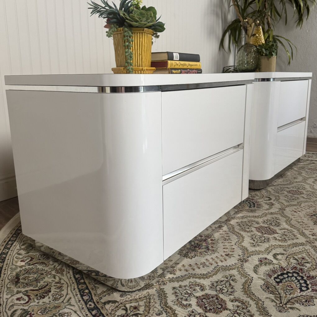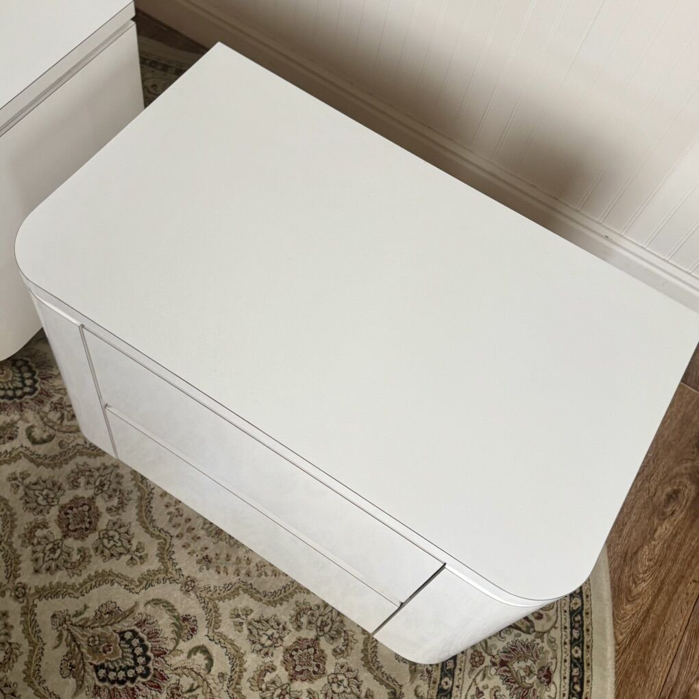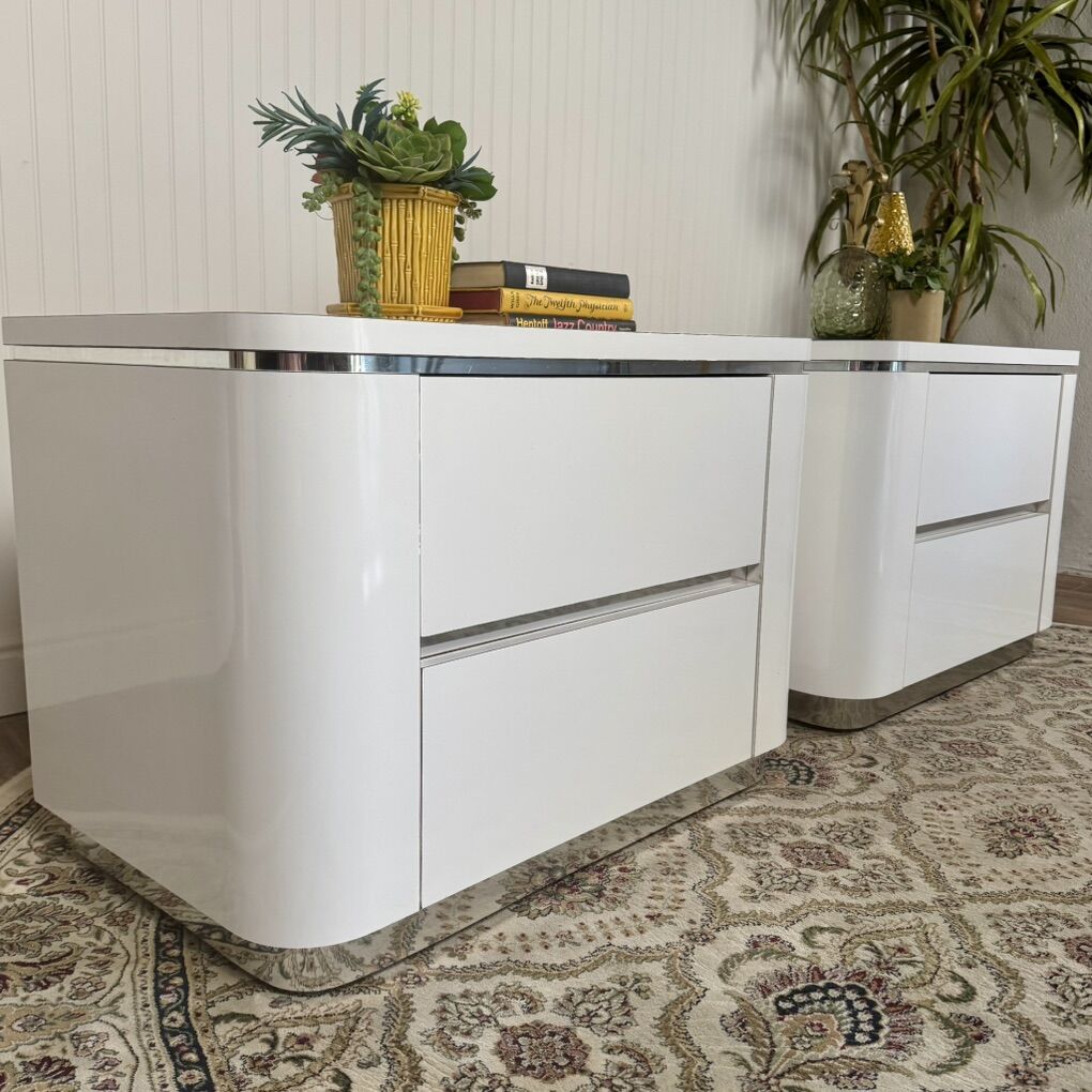 ApplePayA pair of vintage high-gloss lacquer nightstands by Beautyline Furniture (Salt Lake City, UT), circa 1980s. Sculptural post-modern silhouettes with rounded waterfall corners, chrome banding, and sleek integrated pulls. Heavy, well-built, and beautifully minimal — the perfect blend of vintage glam and contemporary modern style. Ideal for modern, Hollywood Regency, and designer interiors. Great condition—only minor signs wear. All drawers slide smoothly.