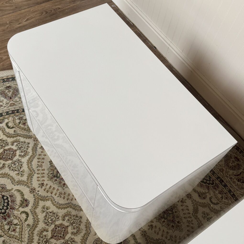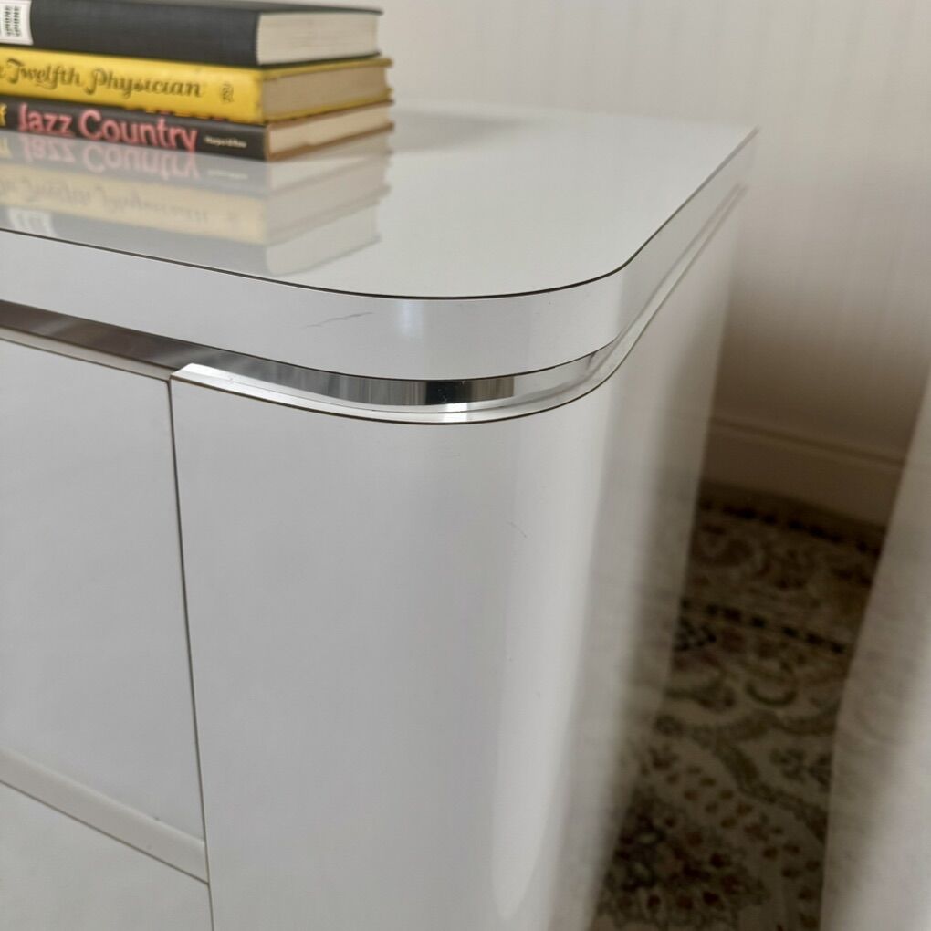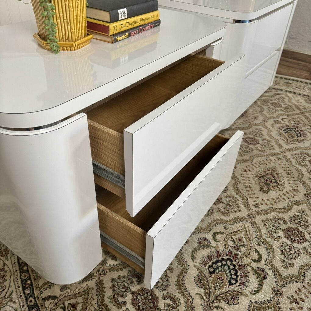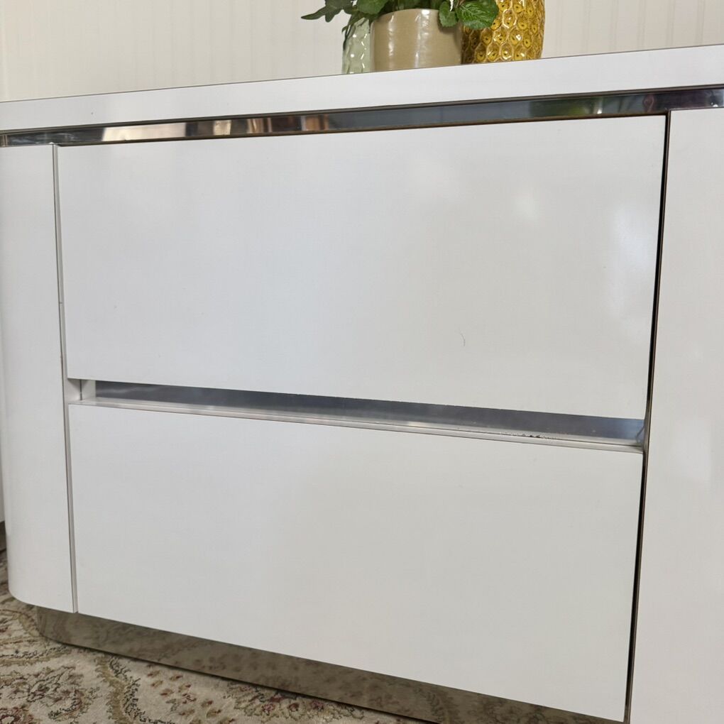 ApplePayA pair of vintage high-gloss lacquer nightstands by Beautyline Furniture (Salt Lake City, UT), circa 1980s. Sculptural post-modern silhouettes with rounded waterfall corners, chrome banding, and sleek integrated pulls. Heavy, well-built, and beautifully minimal — the perfect blend of vintage glam and contemporary modern style. Ideal for modern, Hollywood Regency, and designer interiors. Great condition—only minor signs wear. All drawers slide smoothly.