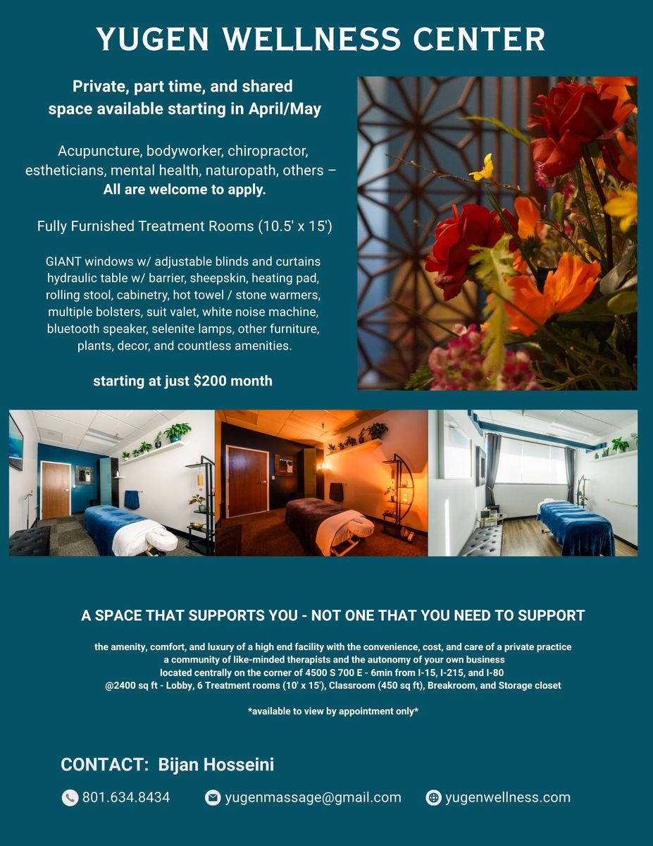 Treatment rooms all have GIANT windows (with both blinds and curtains), hydraulic tables, rolling stool, storage cabinet, double stack hot towel/stone warmers, bolsters (jumbo, regular, and half size), suit valet, white noise machines, bluetooth speaker, selenite lamps, plus other furniture, furnishings, plants, and decor.
