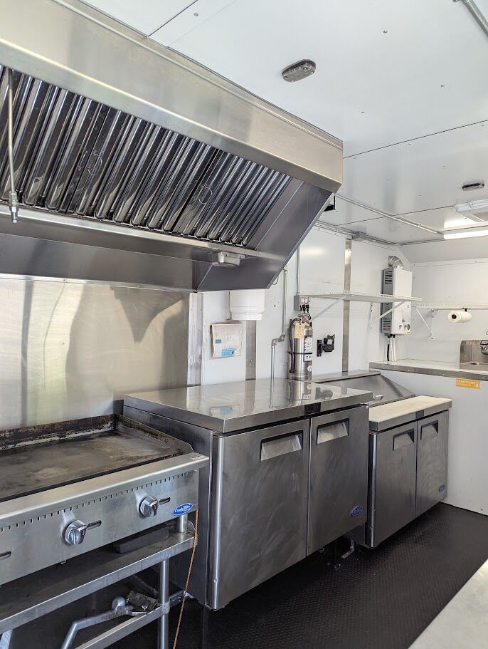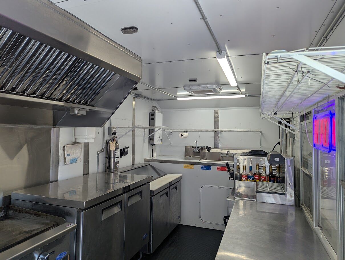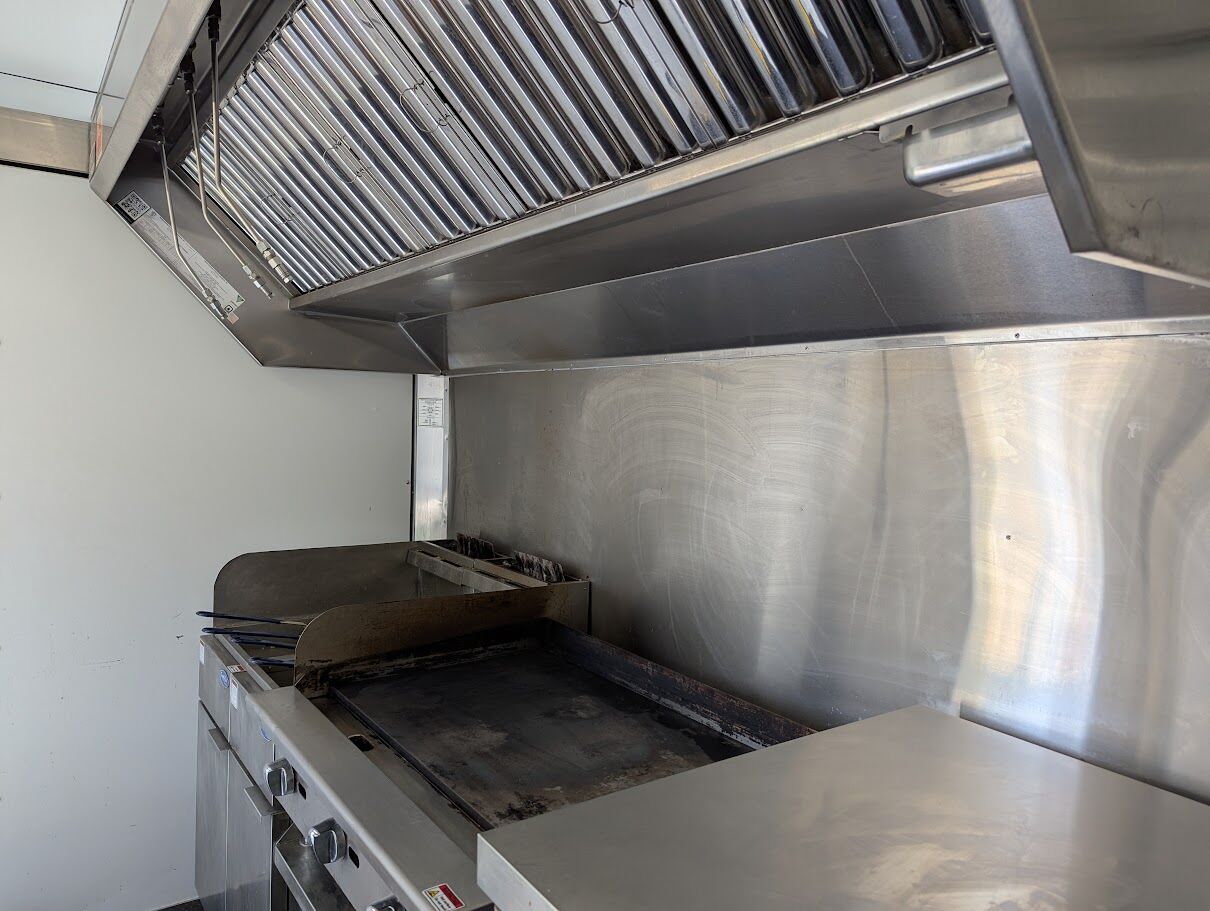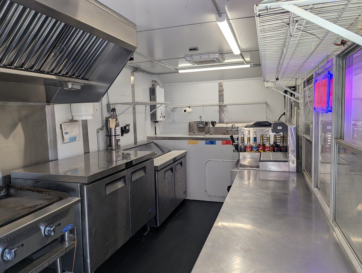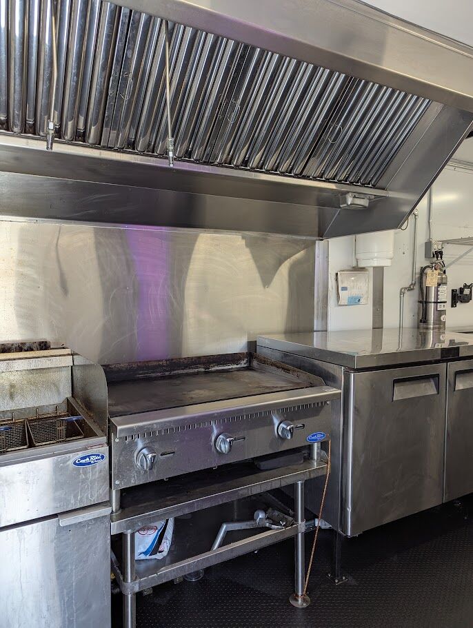 It includes a commercial fire suppression system, professional ventilation, ample prep space, and power designed for real service — not a starter build.
