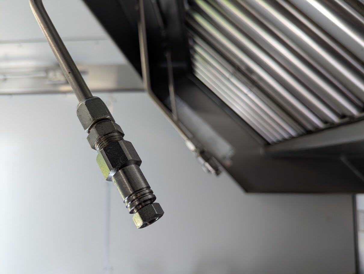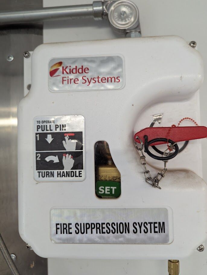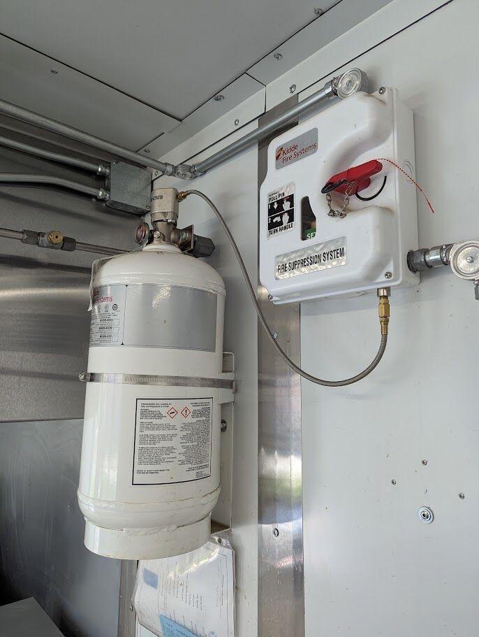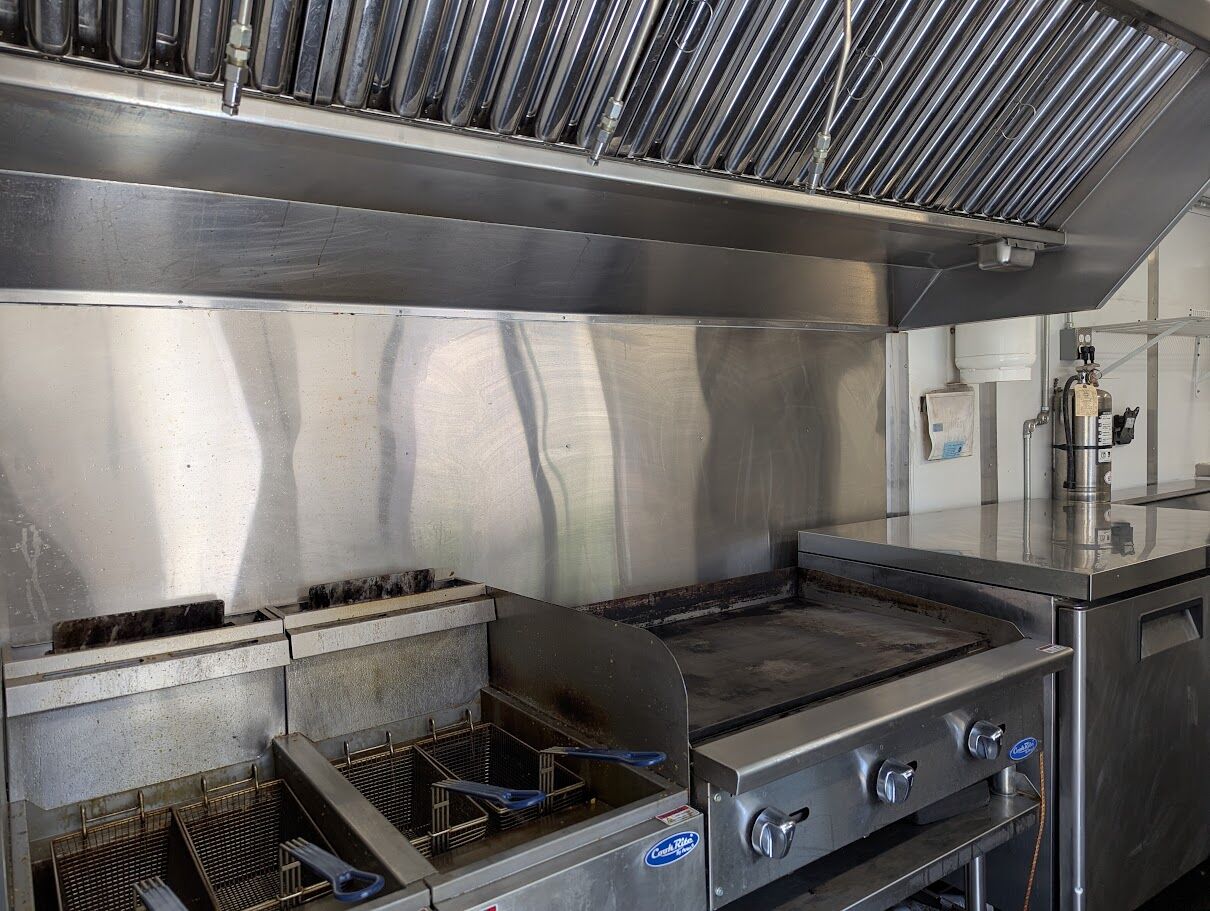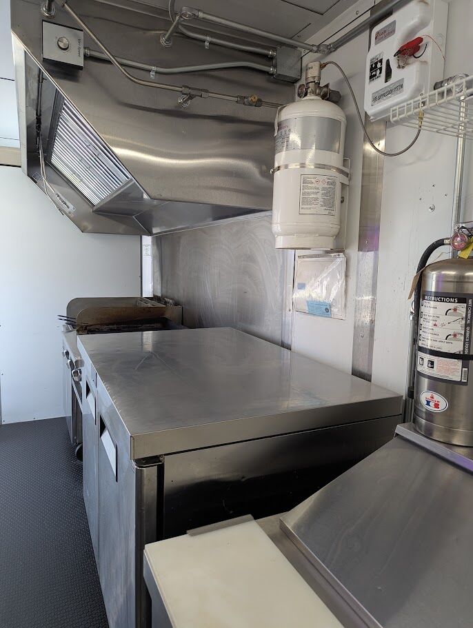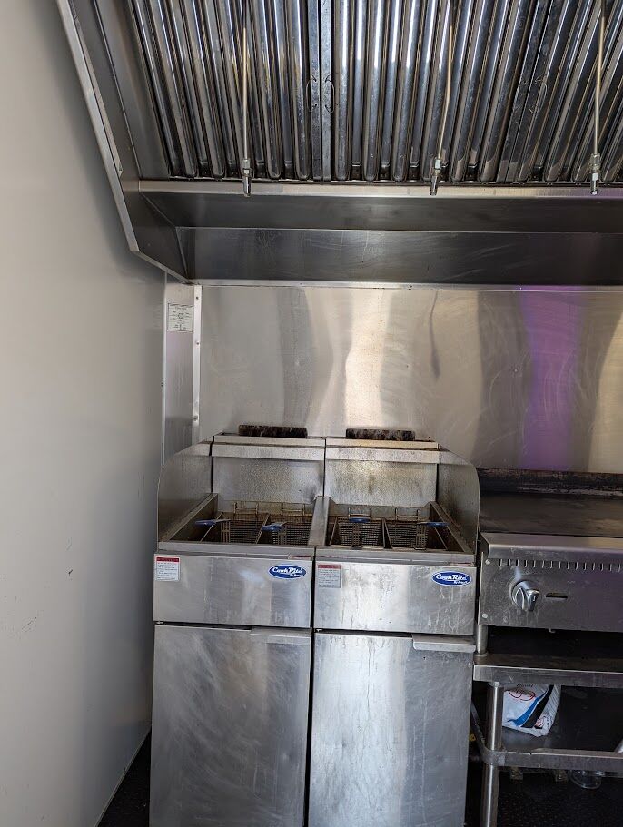 It includes a commercial fire suppression system, professional ventilation, ample prep space, and power designed for real service — not a starter build.