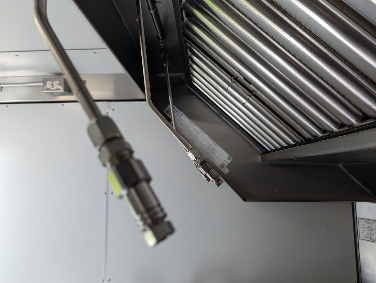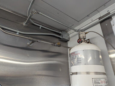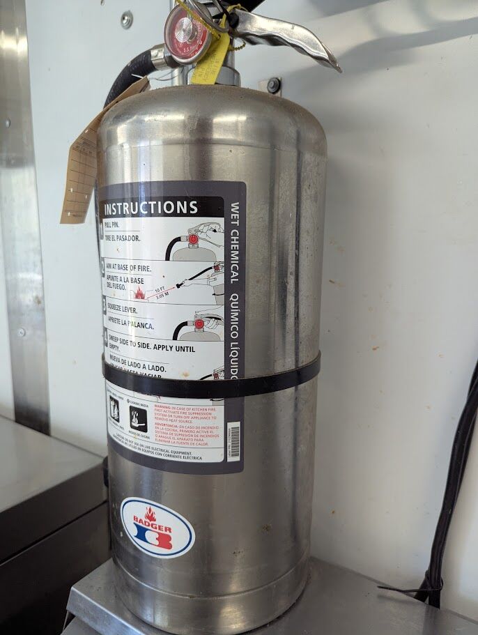 It includes a commercial fire suppression system, professional ventilation, ample prep space, and power designed for real service — not a starter build.