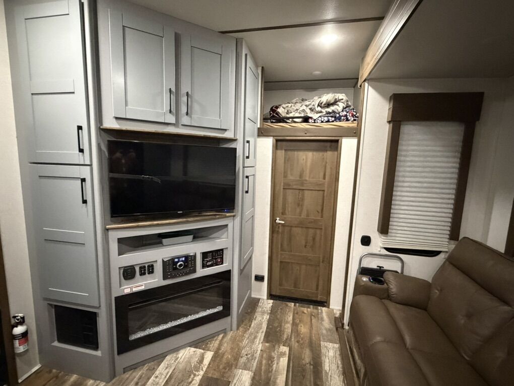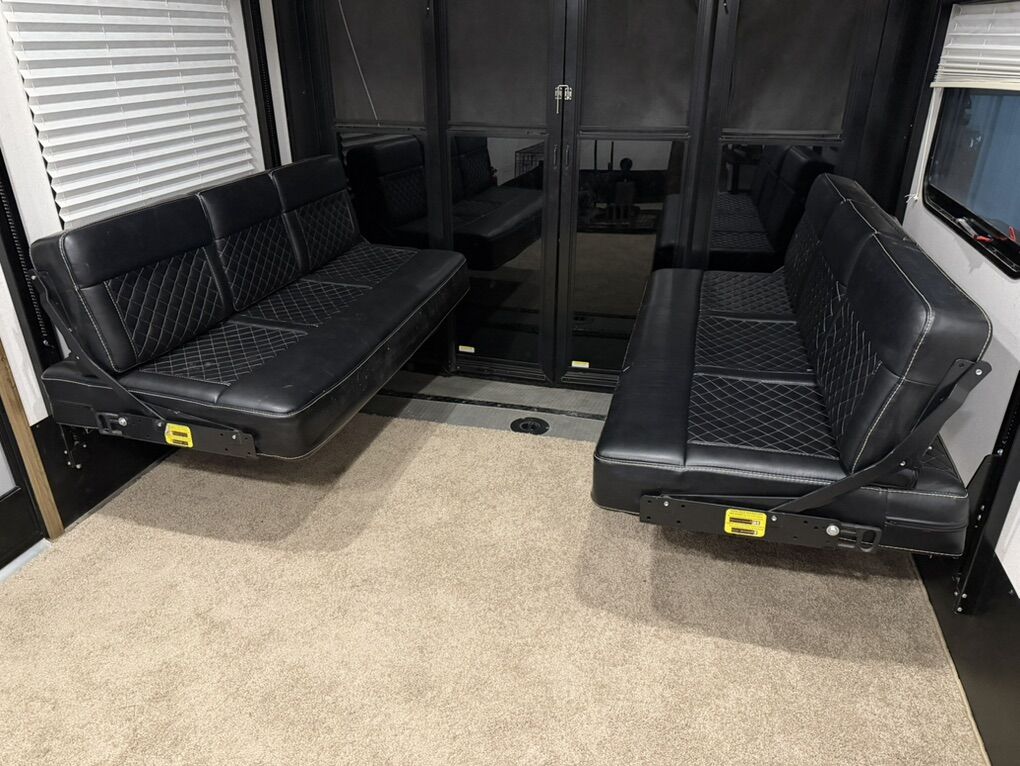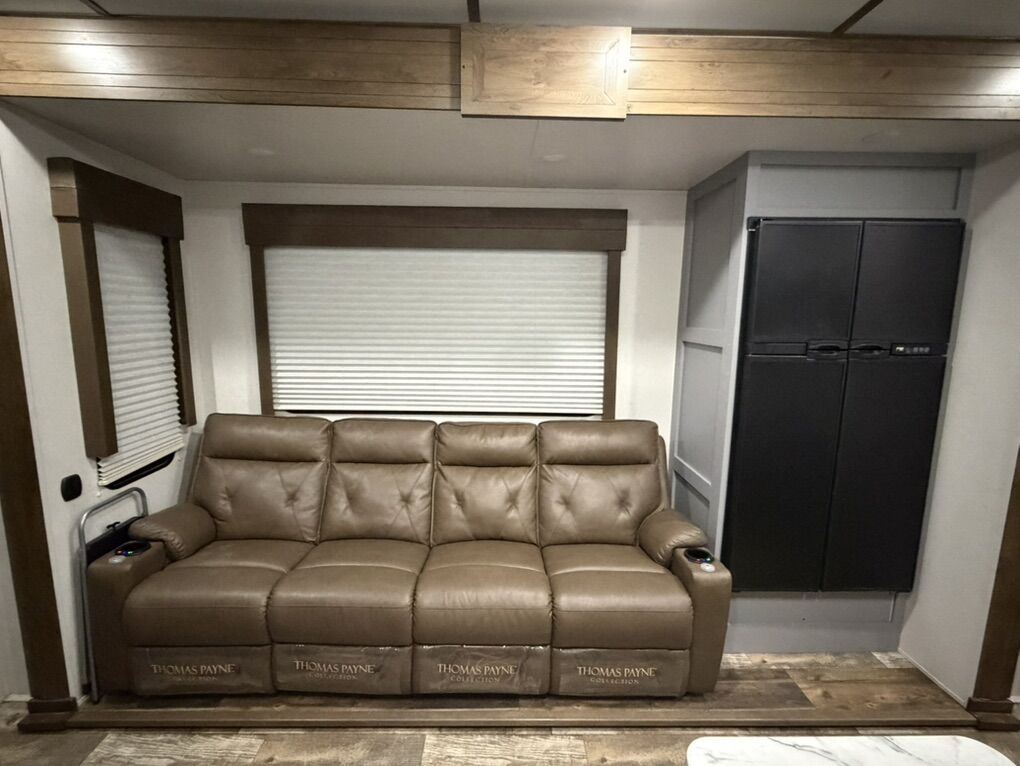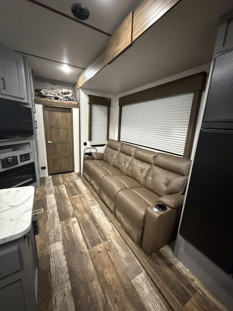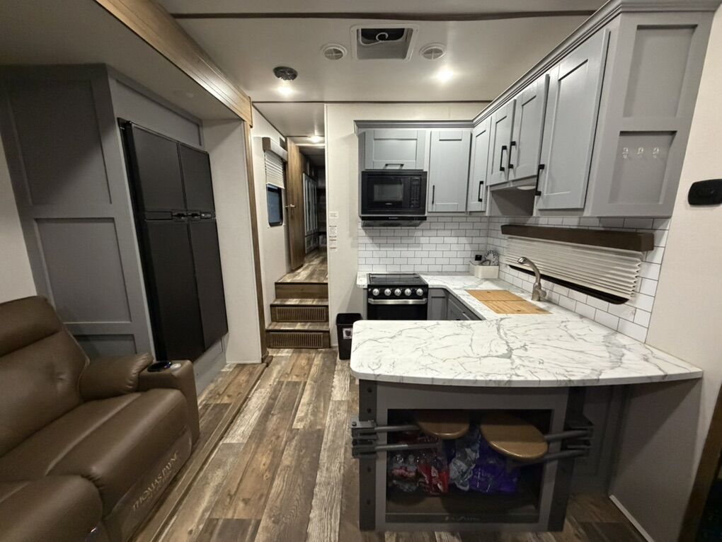 Inside you’ll find a U-shaped kitchen with high-end finishes, large residential-style refrigerator, three-burner cooktop, and deep stainless sink. Hardwood cabinetry, no carpet (easy to clean vinyl flooring) and a comfortable living area with electric fireplace, entertainment center and four seat reclining leather couch. The master bedroom features a king-bed with bedside USB outlets, TV, and plenty of storage.