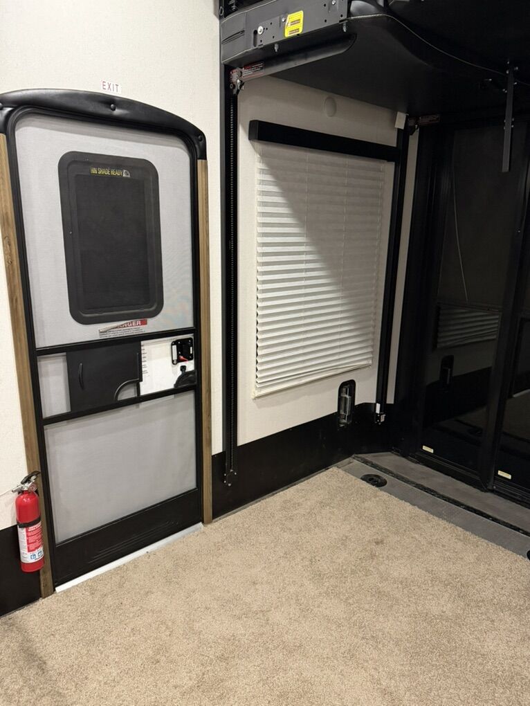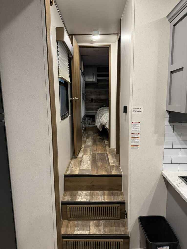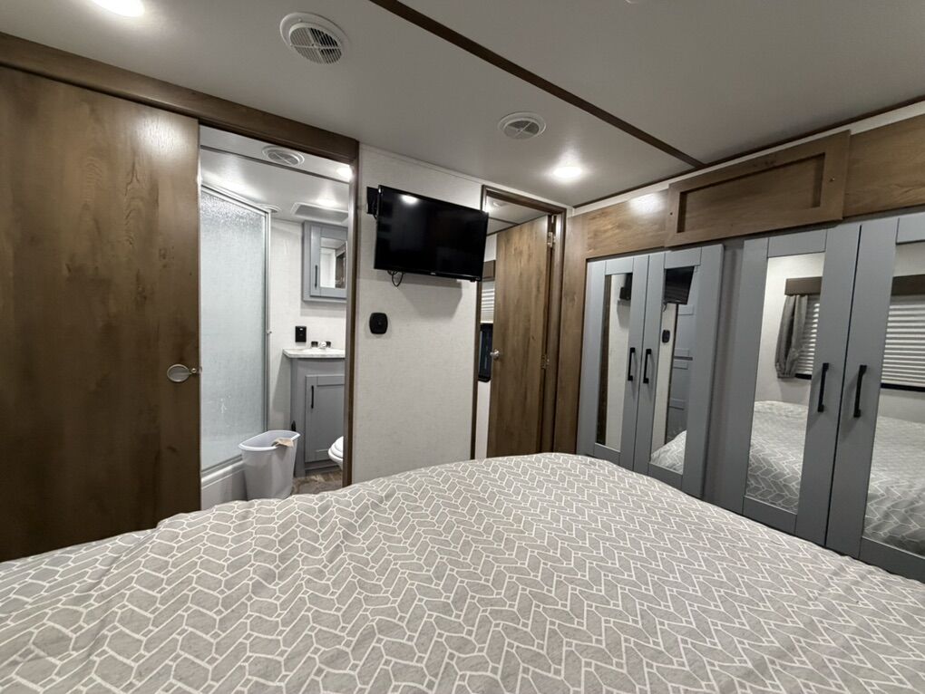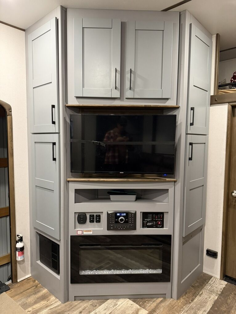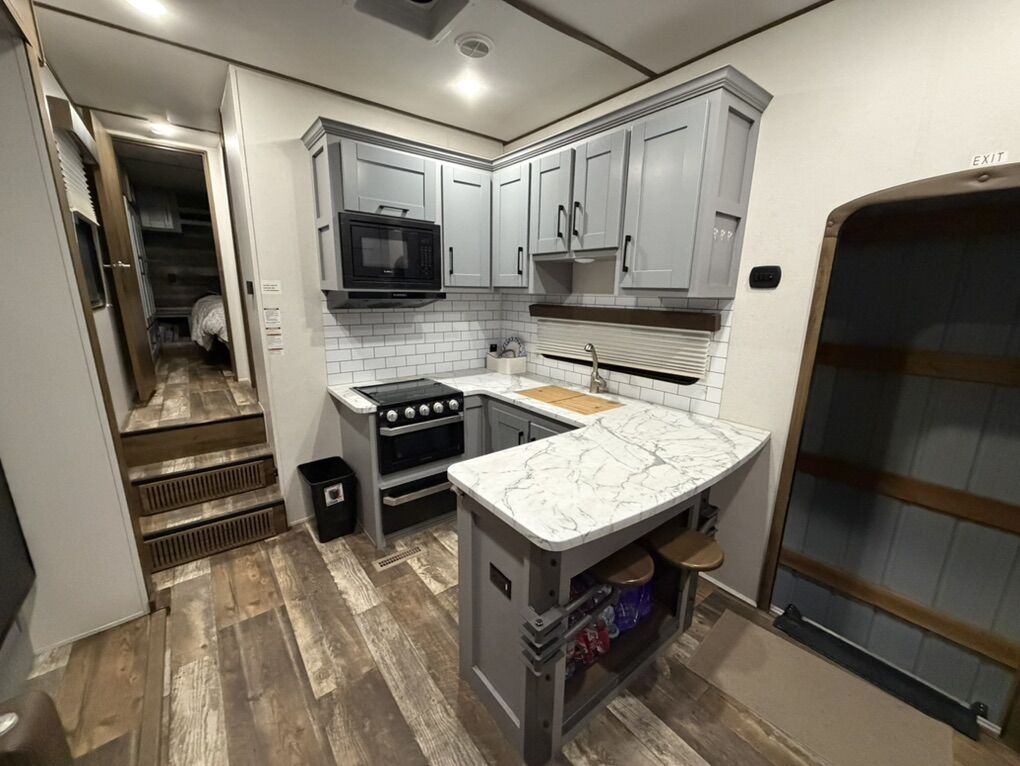 Inside you’ll find a U-shaped kitchen with high-end finishes, large residential-style refrigerator, three-burner cooktop, and deep stainless sink. Hardwood cabinetry, no carpet (easy to clean vinyl flooring) and a comfortable living area with electric fireplace, entertainment center and four seat reclining leather couch. The master bedroom features a king-bed with bedside USB outlets, TV, and plenty of storage.