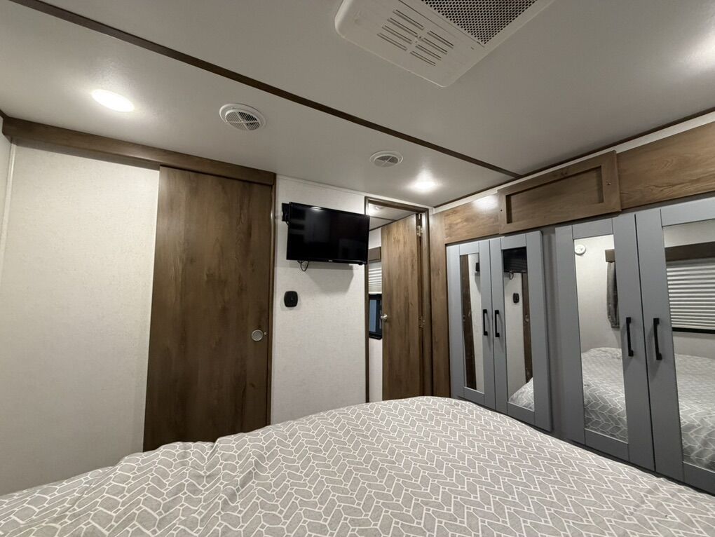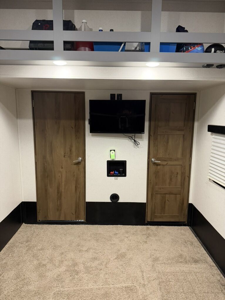 Exterior is built tough: wide-body 100″, laminated fiberglass sidewalls, aerodynamic front cap, walk-on roof, full underbelly insulation and heating, 6-point hydraulic leveling, exterior fuel station, two power awnings with LED lighting, and ample pass-through storage. Outdoor TV and mini fridge. Onboard Onan generator with only 44 hours on it. Trailer has been lifted to accommodate taller trucks for a level ride.