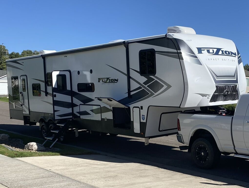 Purchased new in 2020 at Smith RV (Idaho Falls). Always stored indoors in a shop year-round, impeccably maintained. This 44-foot toy hauler features a massive 15-foot garage perfect for hauling UTVs, bikes, or using as extra living/guest space. TV and washer/dryer hookups.