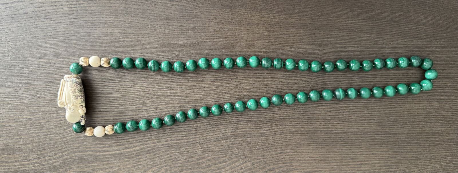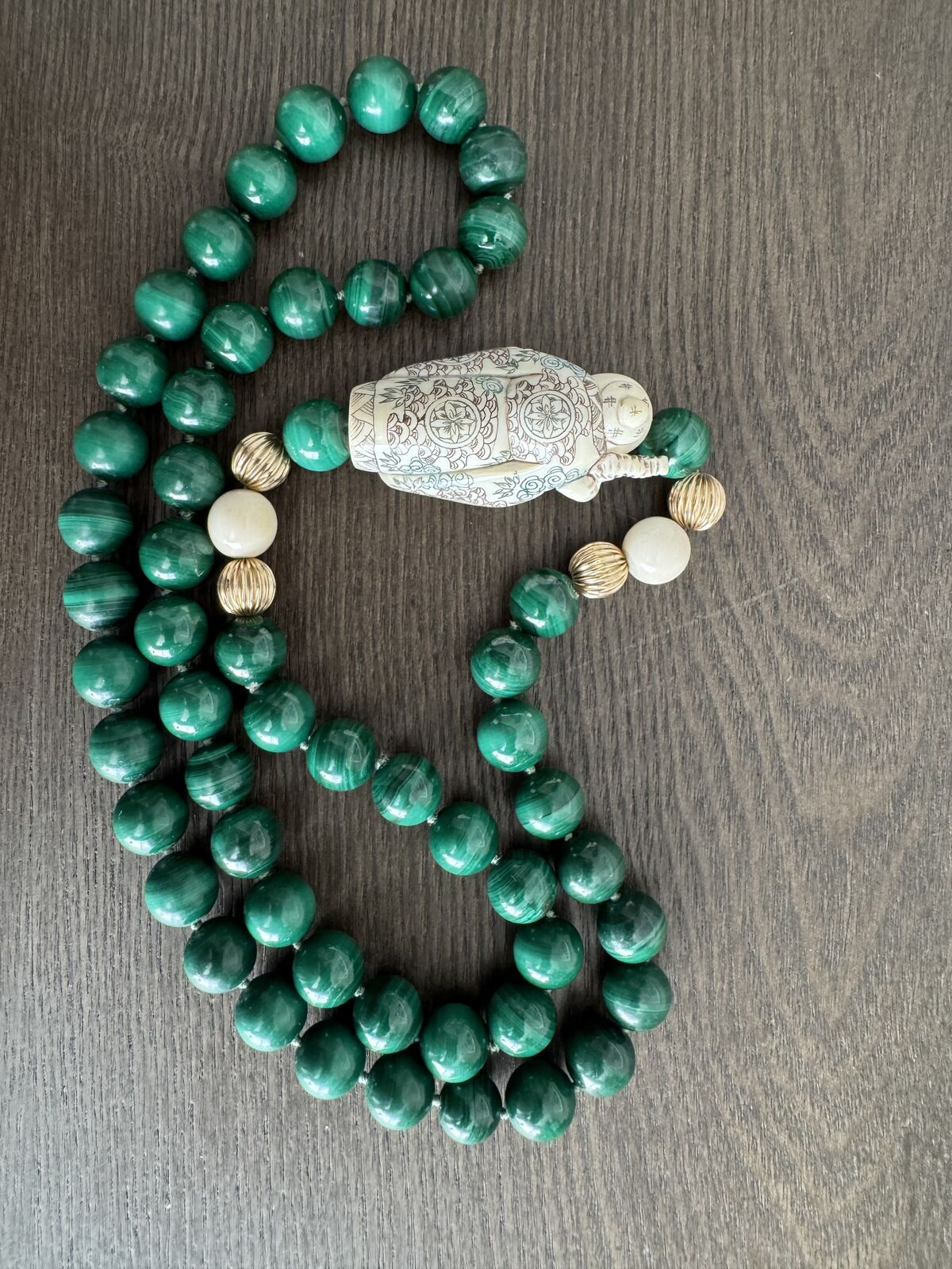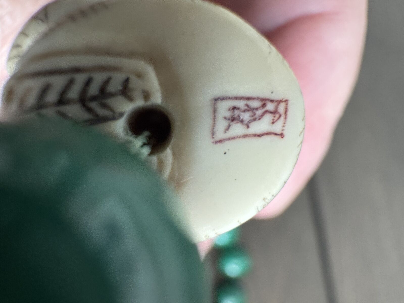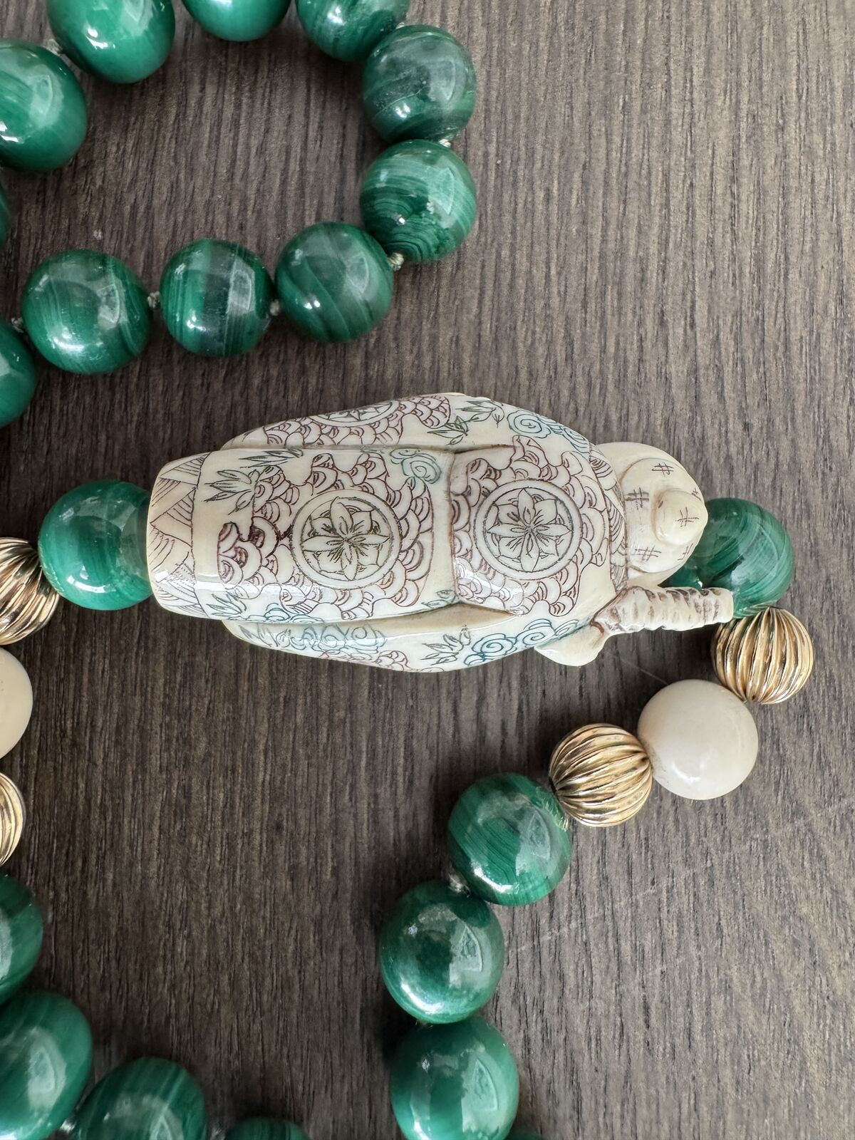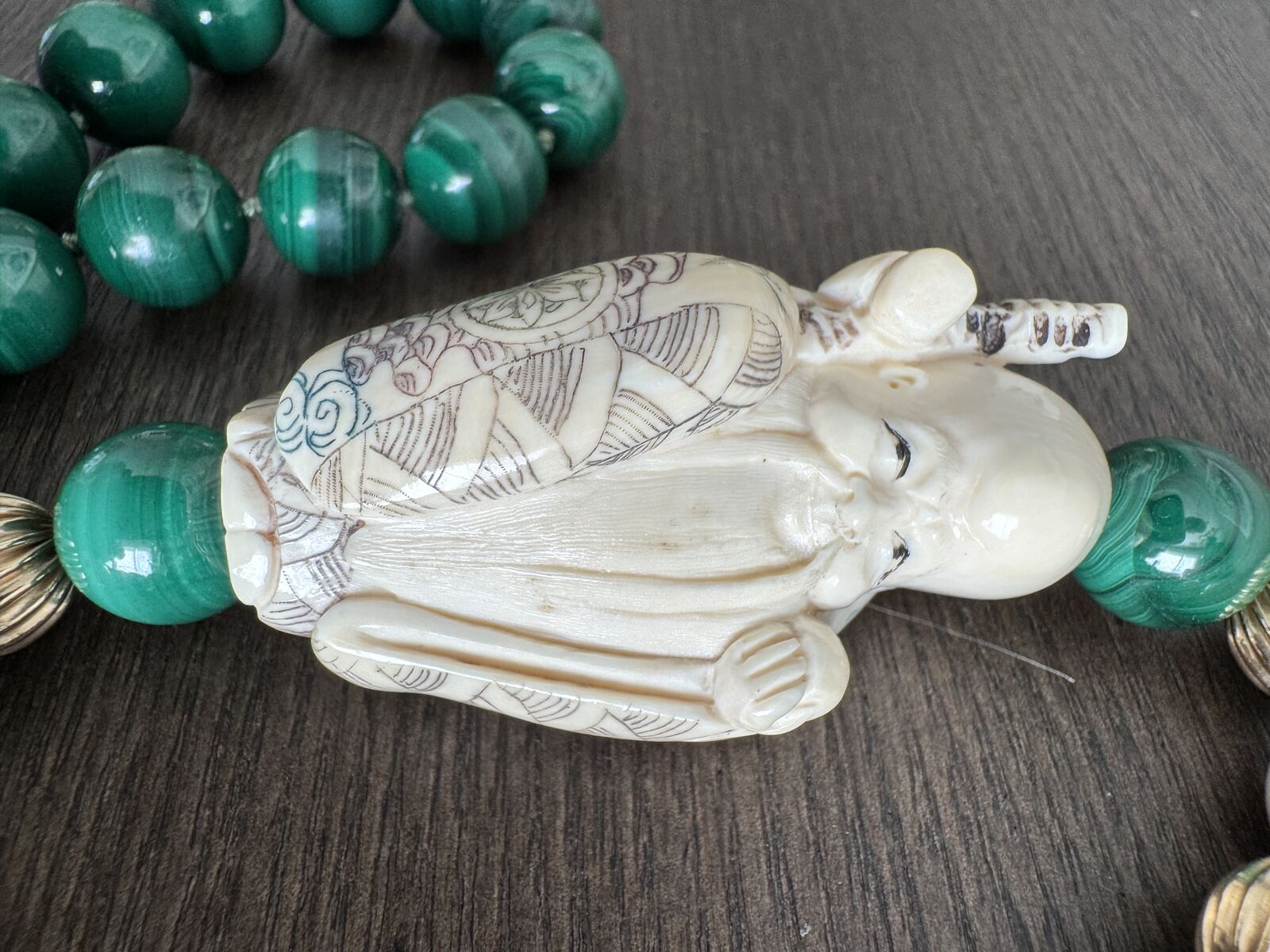 ZelleUntested beads and likely 14K gold given the quality of this heavy necklace; wonderfuilly carved and designed Netsuke piece. Priced to sell.
