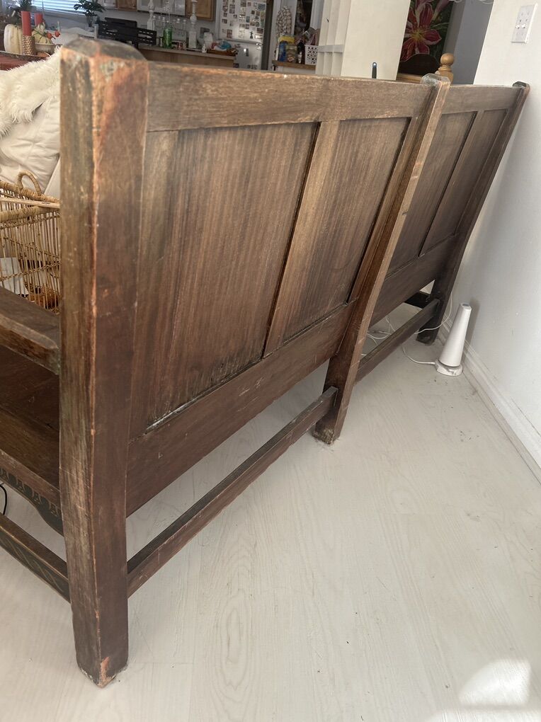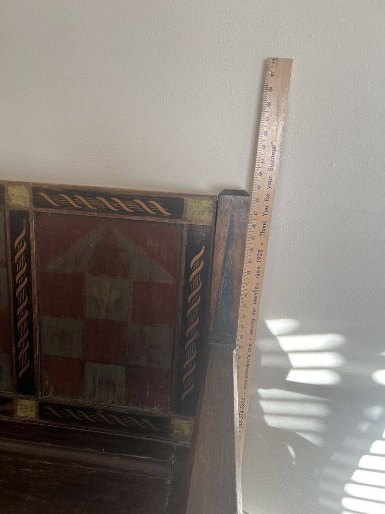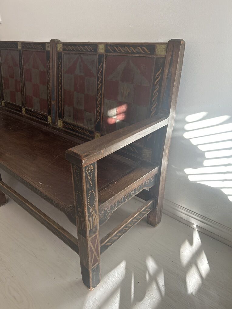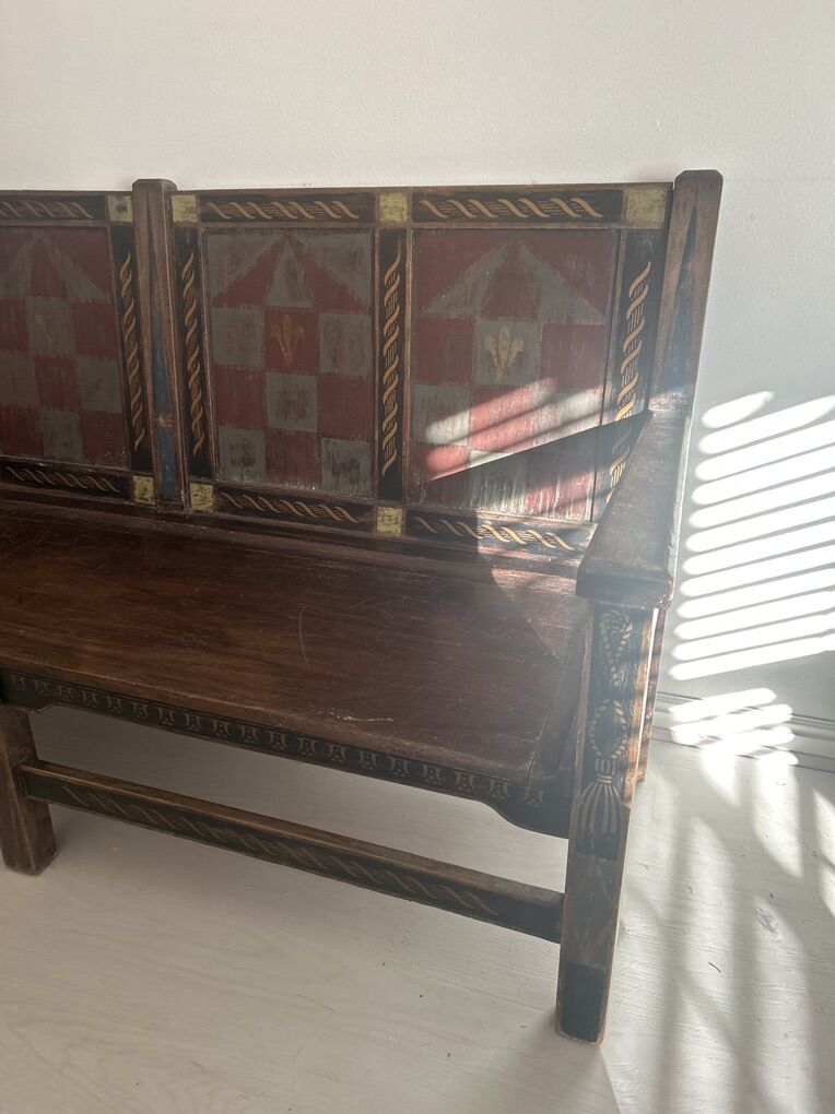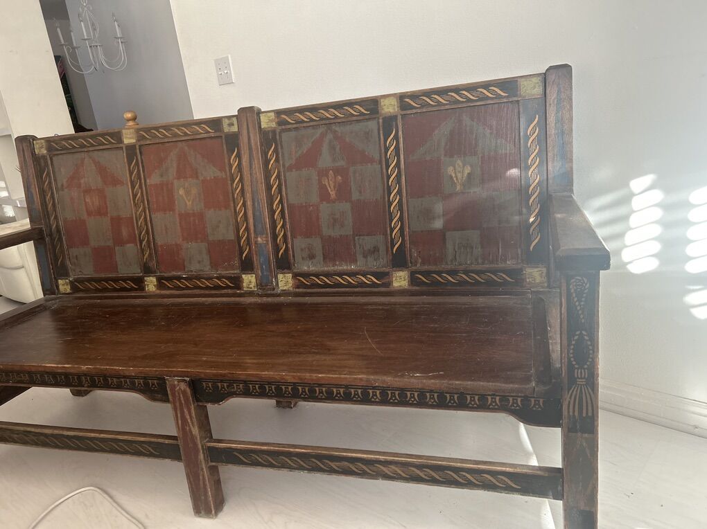 VenmoLong wooden bench (teak wood??) Measurements: 72 inches long, 39 inches high (27 inches depth). Stencil paint designs.