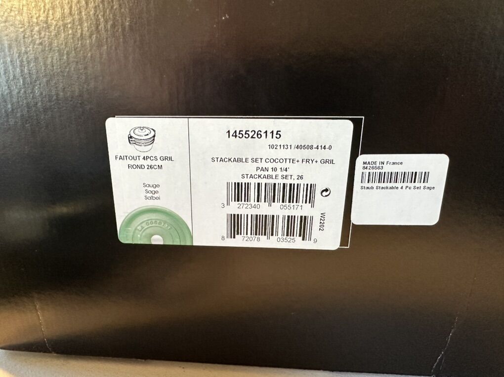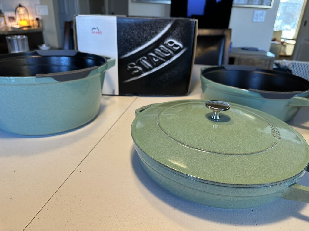 VenmoWilliams Sonoma Staub stackable enameled cast iron set in sage green. Includes Dutch oven, braiser, grill pan, and lid. Excellent condition, with some pieces never used. no major chips or scratches. Have original box from Williams and Sonoma. Great Christmas present! Retails for ~$600