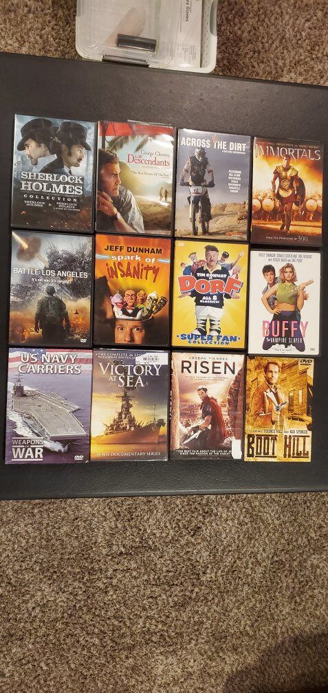 VenmoI have 8 assorted movies, 3 documentaries and 2 comedy shows.1- Boot Hill Western. 2- Risen. 3- Battle of Los Angeles. 4- Buffy the Vampire Slayer the movie. 5- Sherlock Holmes. 6- Sherlock Holmes A game of Shadows. 7- The Descendants w/George Clooney. 8- Immortals. Documentaries 1- US Navy Carriers Weapons of War. 2- Victory at Sea. 3- Across the Dirt dirt bikes. Comedy 1- Jeff Dunham spark of insanity. 2- Tim Conway is DORF 8 classics. All excellent movies and shows. asking 3 dollars.