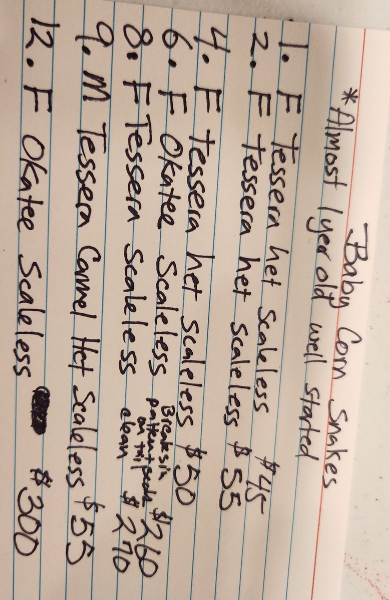 Venmobeautifull scaless and het scaleless baby corn snakes hatched June 2025. Prices start at $45 and go up to $300. Pictures of mother (prooven and entertaining offers) and father are included. Contact me for more information. Current price list is in the pictures.