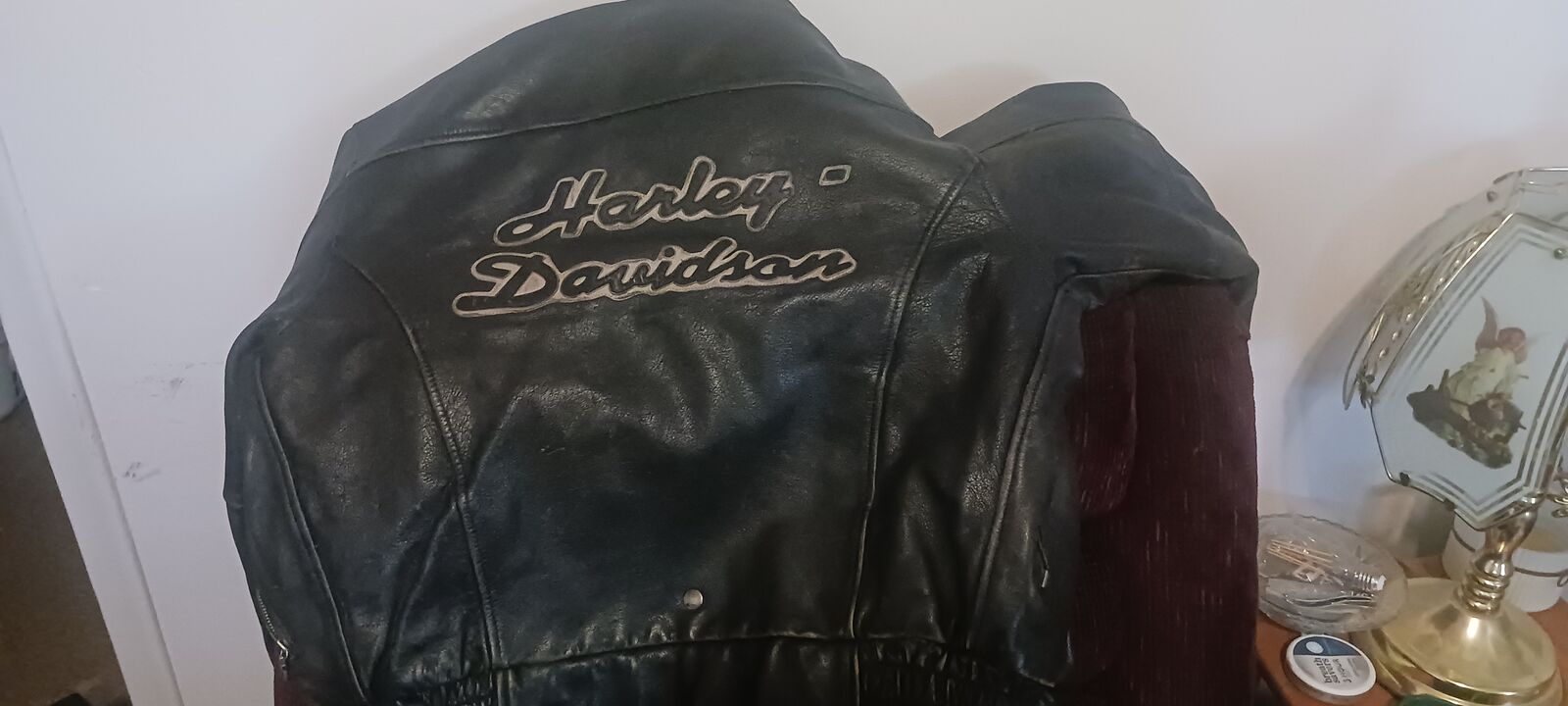 Vintage HD black on black white shadow bomber style leather jacket. Average to small build. Gotta see and feel to appreciate this RARE ol' ridding jacket.