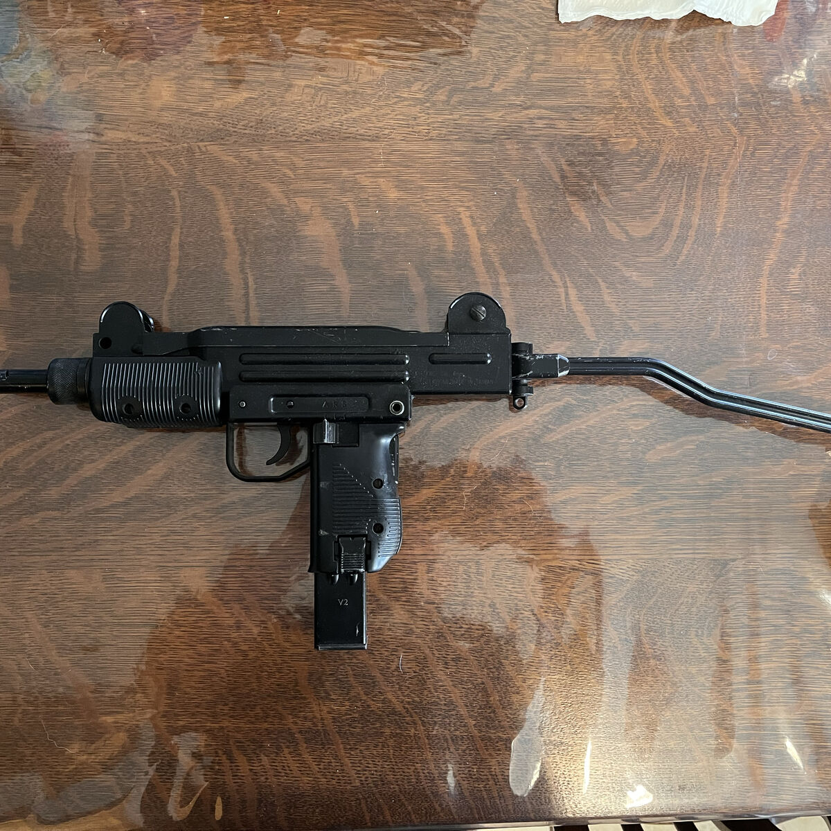 Kwc full metal uzi. CO2 powered. This gun is great but I lost the bolt that holds the charging handle in so you can’t charge it. I do still have the charging handle and I’m sure it’s an easy fix. I just don’t care to figure it out. Feel free to message me with any questions
