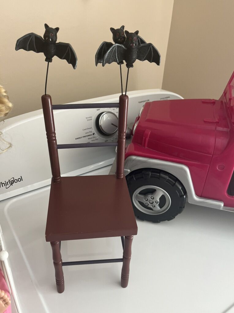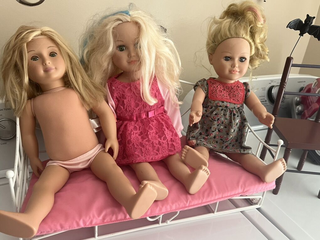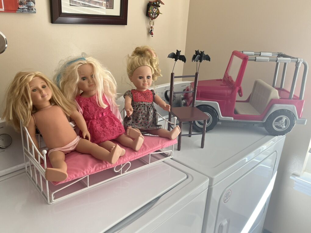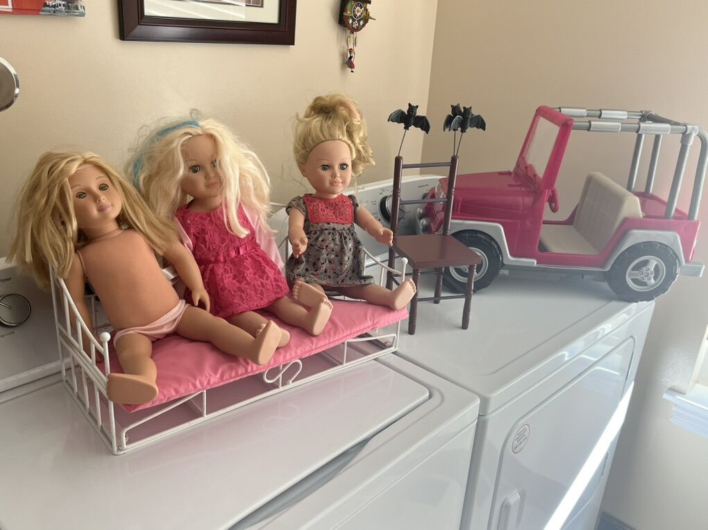 American girl doll sized dolls and furniture. All prices listed below. Dolls $20 each Bed and jeep $30 each Wood chair $20