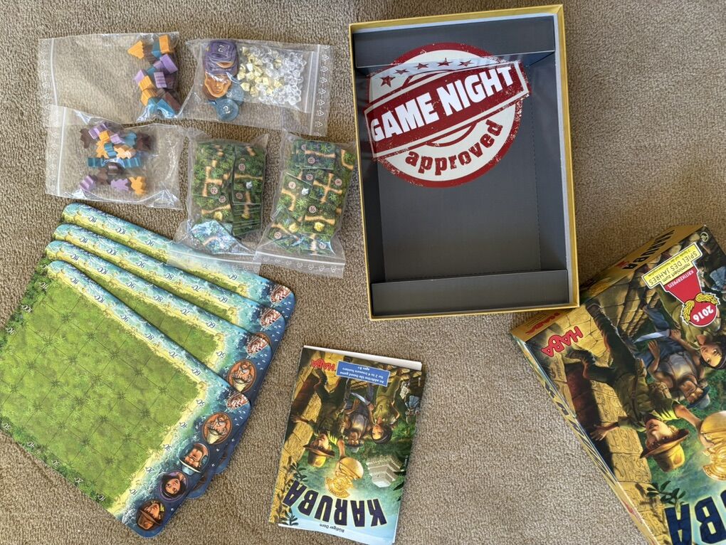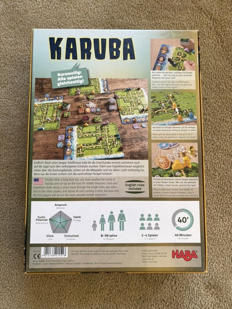 COMPLETE Karuba Board Game. Award-winning game by HABA, Rudiger Dorn, 2016. Ages 8+, 2-4 players. High-quality game made in Germany. Complete, no missing pieces. Excellent condition. Text only. Cash or Venmo.