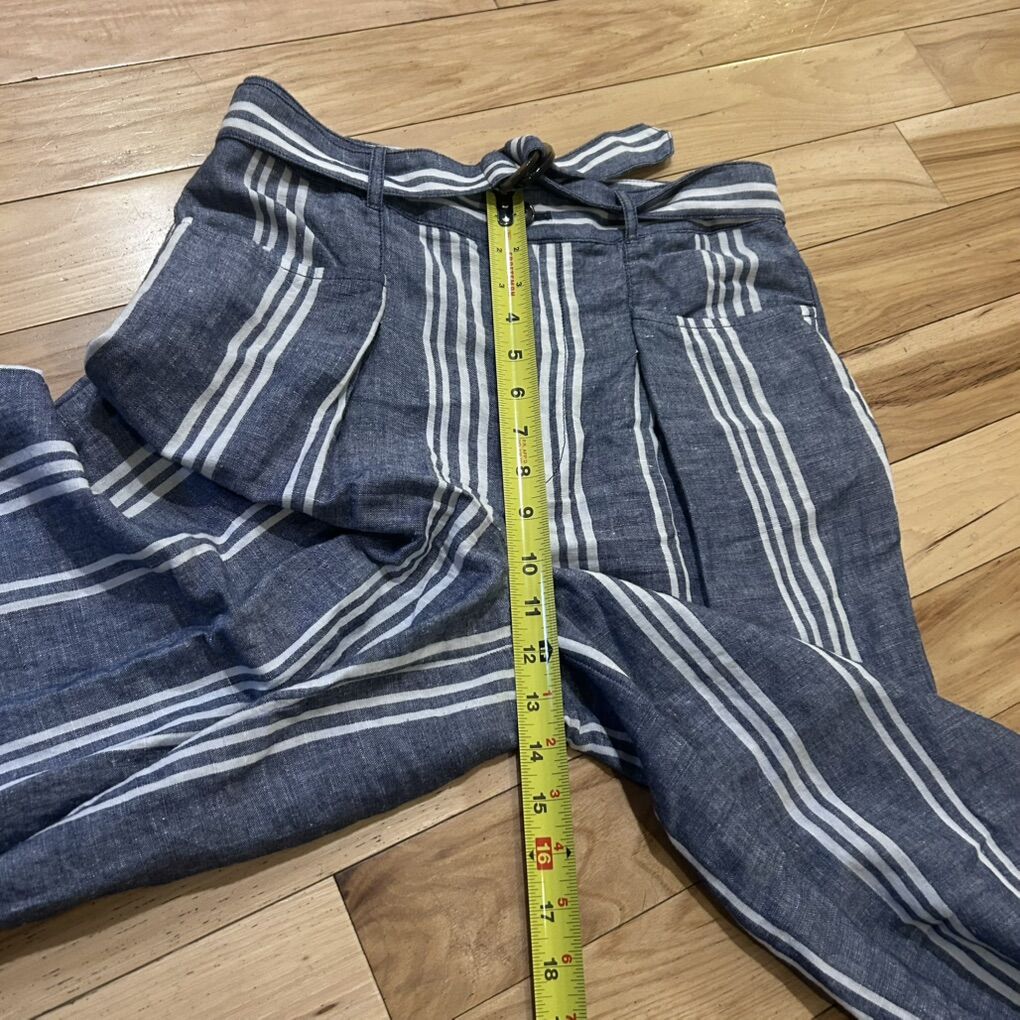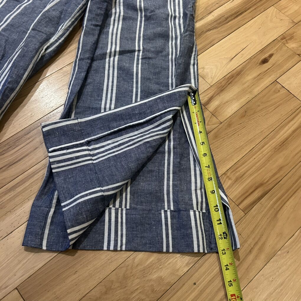 by Anthropologie Beachy Waves Linen Blue & White Striped Wide Legged Pants - Women’s Size 4 - made of 58% linen - with waist belt, pockets, ankle slits and button and zipper closure - excellent condition - pre-owned.