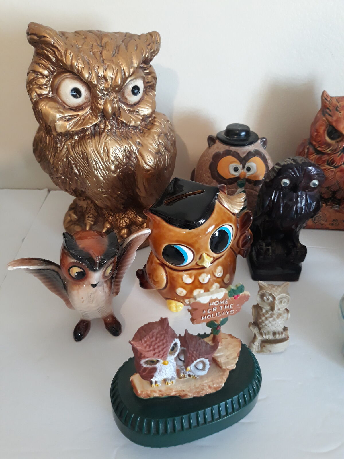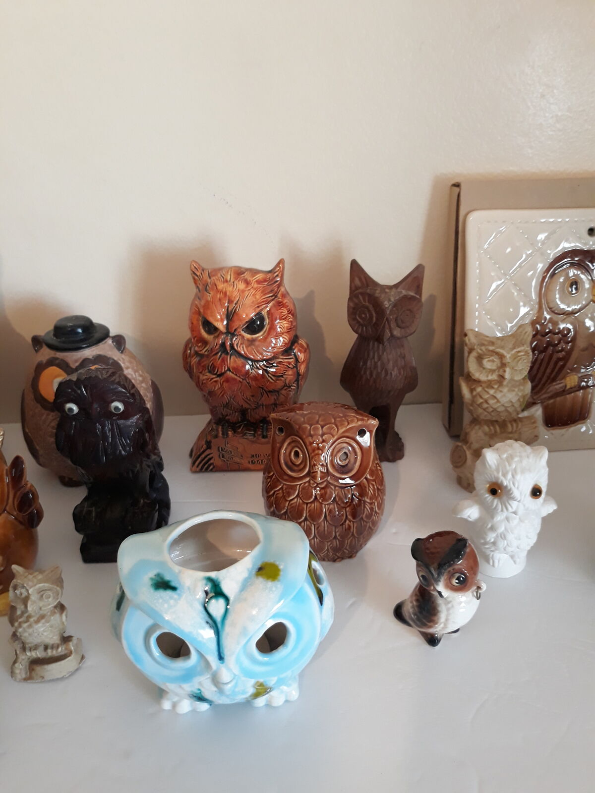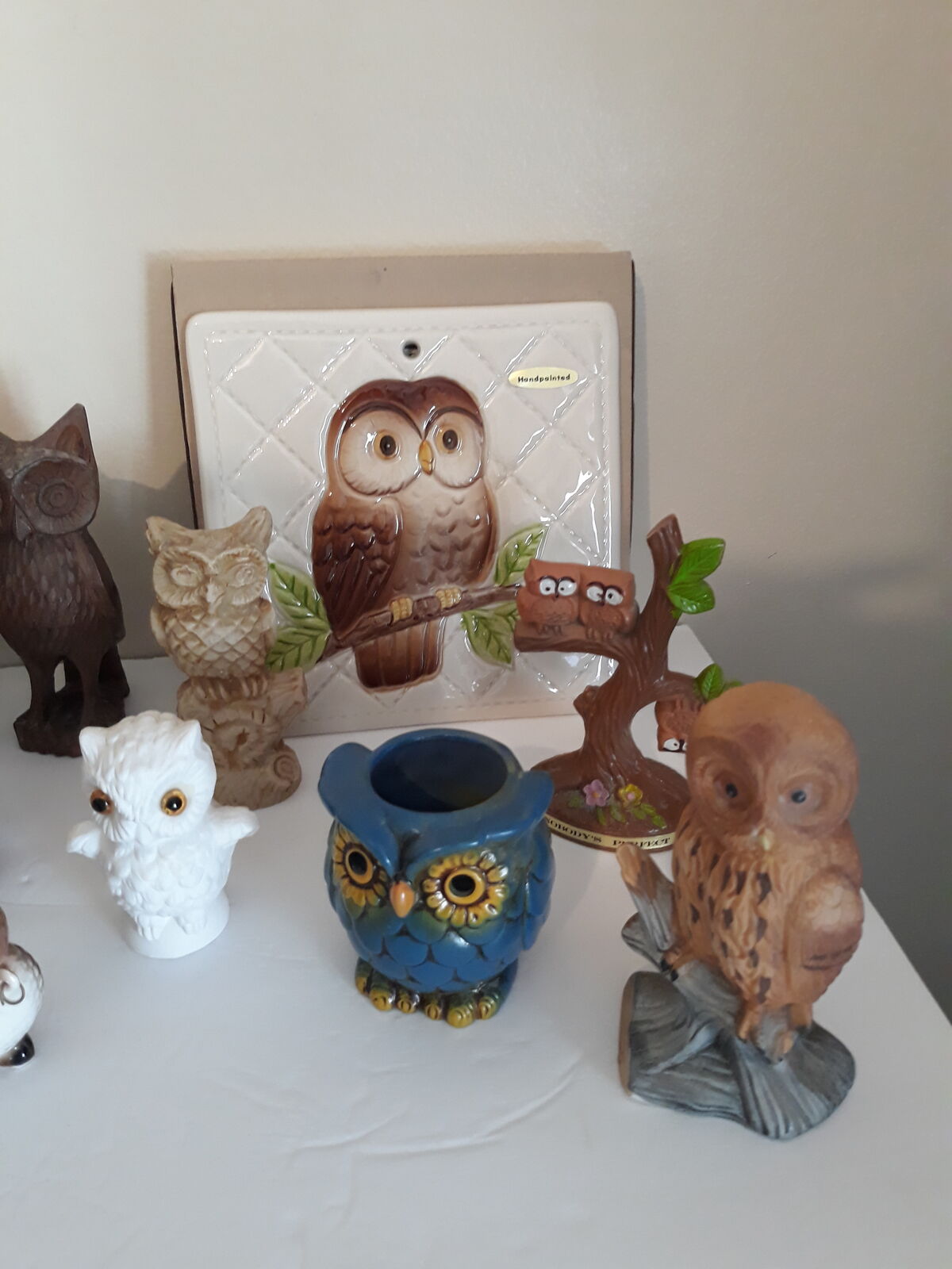 This is nice collection of owls. They are ceramic, stone, plastic, etc. Some hold tealight candles, 2 are piggy banks, one plays music. I have a couple more owl listings if you're interested in more. Phone calls or texts please. Cash only. Thanks for looking!