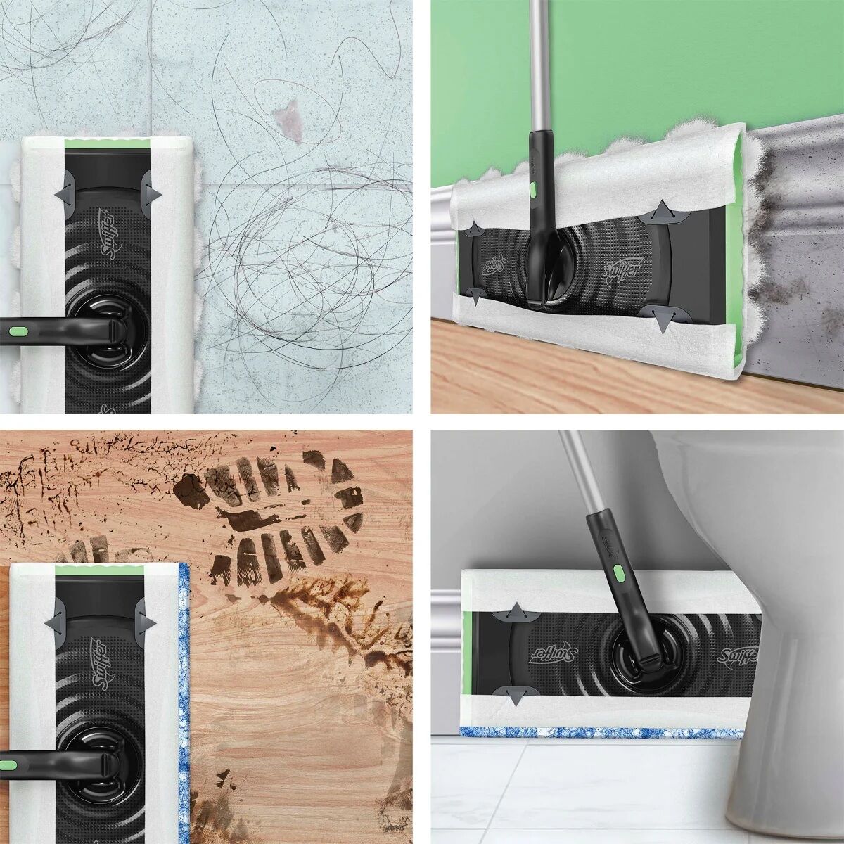 Swiffer Sweep and Mop Deluxe is a 2-in-1 cleaning tool designed for efficient floor cleaning and great for small spaces. This device features a collapsible pole that shrinks to 25 inches for easy storage. The device is more durable** which makes tackling tough messes easy. The locking head enables allows you to clean your baseboards and tight spaces. Start by using a Heavy Duty Sweeping Cloth to capture hair, dirt and dust, then follow with Heavy Duty Mopping Pads to dissolve and trap grime, and trap it away. The combination of sweeping and mopping in one tool simplifies your cleaning routine. Refill cloths are available.***