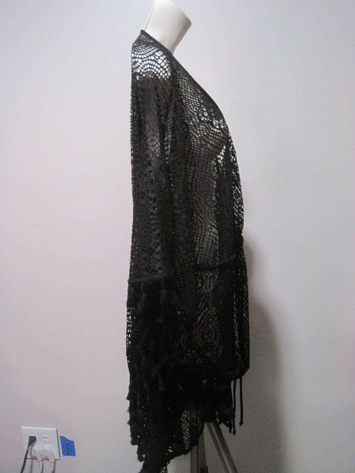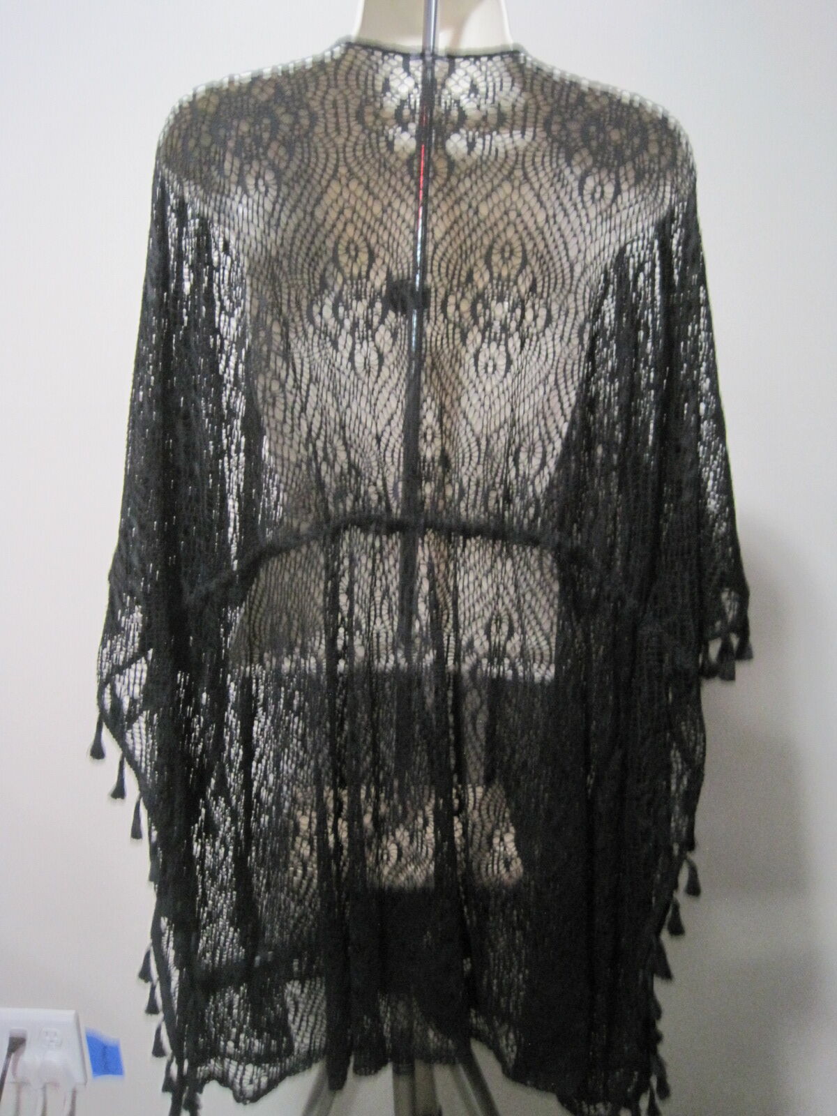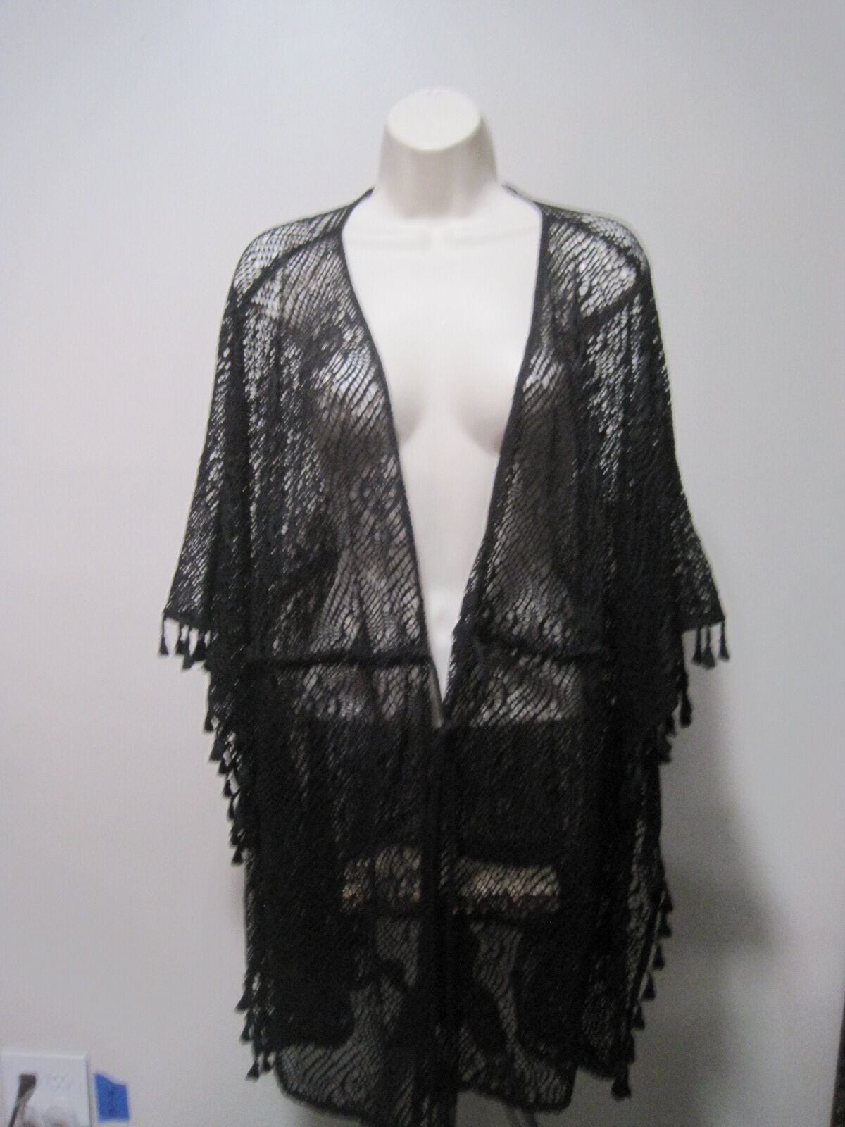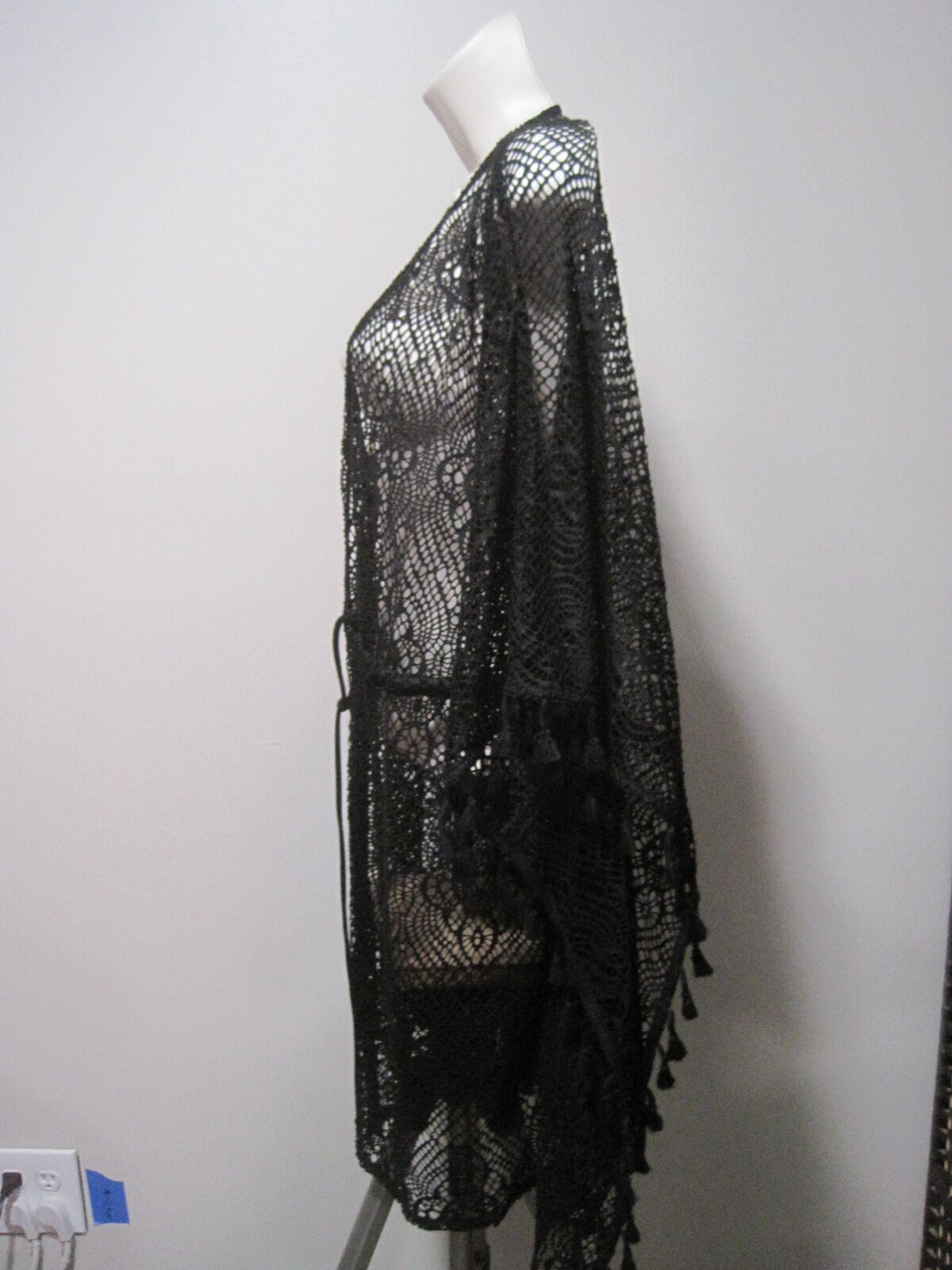 The Time & Tru Black Crochet Lace Kimono Cardigan Cover Up is a stylish and versatile addition to any woman's wardrobe. This cover up features a floral crochet pattern, short kimono sleeves, and a lace-up closure for a personalized fit. The tassel trim adds a touch of flair, making it perfect for a party or cocktail occasion. Made with breathable lace fabric, this cardigan is a must-have for summer with its collarless, open design. Perfect for regular sizing in a size Large for women.
