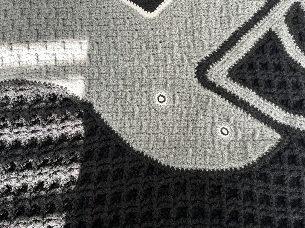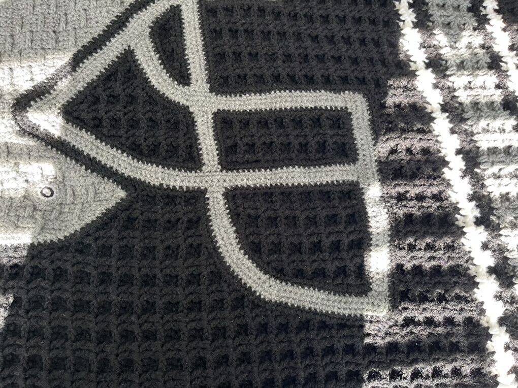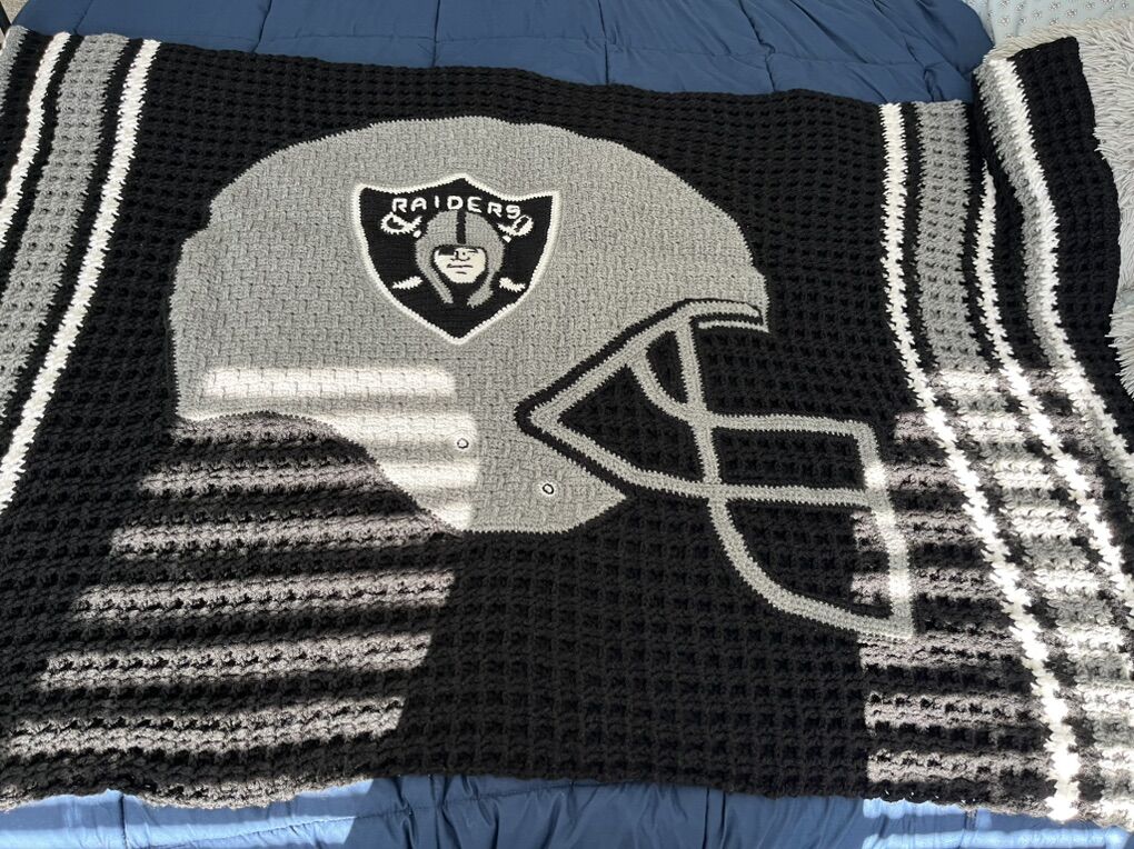 CashAppRaiders handmade crocheted blanket —-W-5‘9“xH 3‘8“ this blanket is an original no other one like it only one made picture is had crocheted and sewn on top to give it a 3-D look what could be better with the setting either on the back of your couch or up on your wall in your man cave, don’t miss out on an original I know our team seems down right now, but you know the Raiders will always get on top send me out an offer. I can’t refuse! Took me over three months to make this blanket. This blanket was done and waffle stitch.