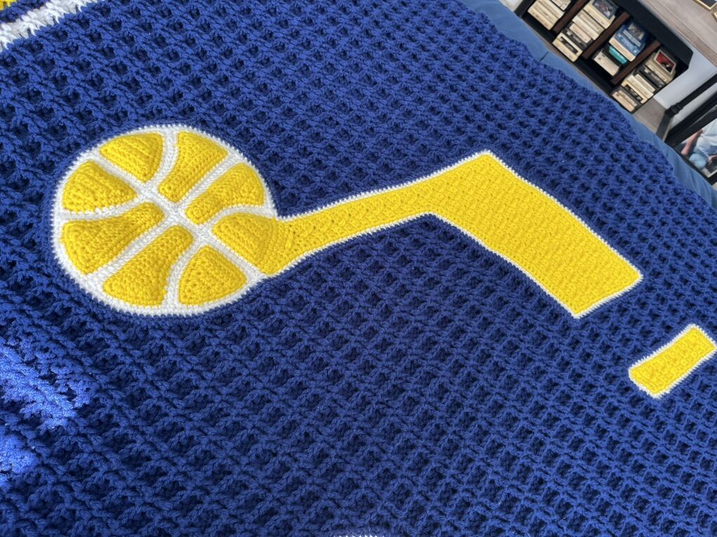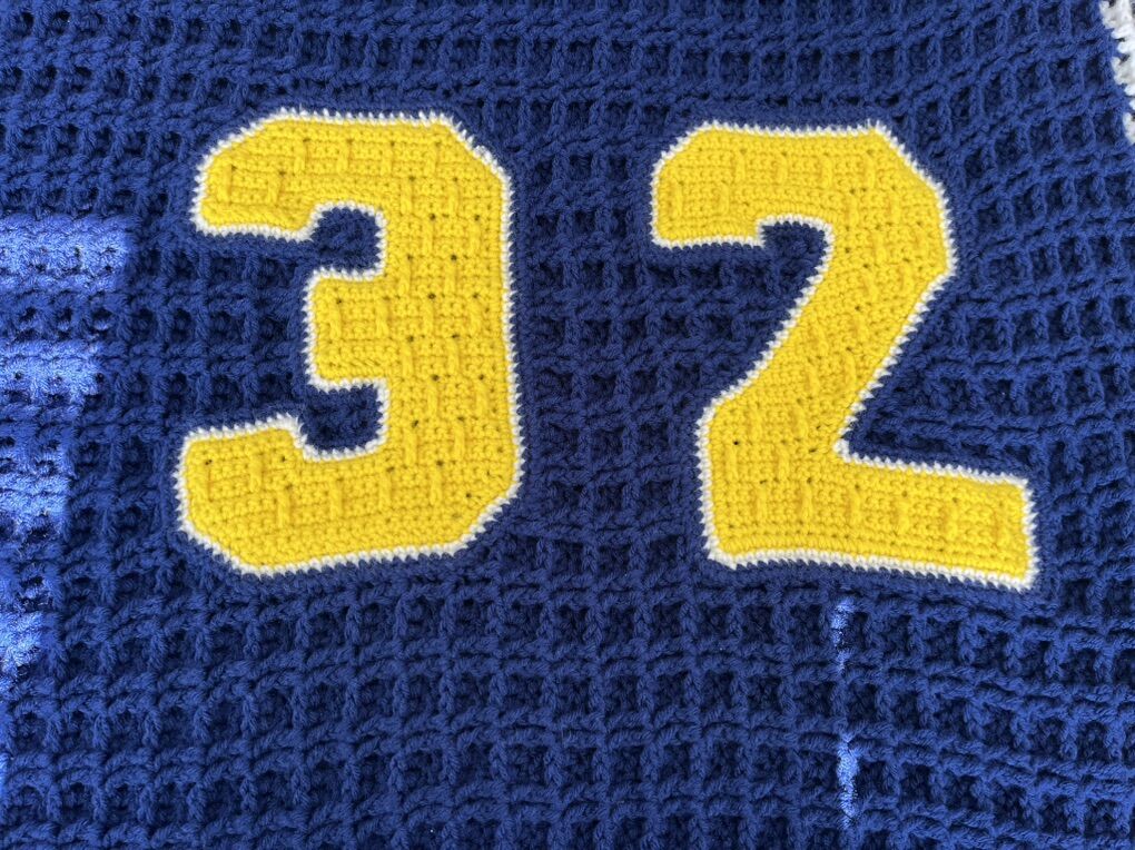 CashApp5’8” in width by 4’3” in height Utah Jazz blanket, Carl Malone, (an original )crocheted pattern and then sewed them to a waffle stitch blanket gives it a 3-D look and fill you won’t find another one like this. Don’t miss out on this one opportunity. I have another one as well that is John Stockton’s and that’s an original too. They’re both on sale right now on my site so if you find this one, you should find the other one by bothand I’ll give you a deal. We can work something out. Shoot me an offer I can’t refuse. This blanket was also done in waffle stitch.