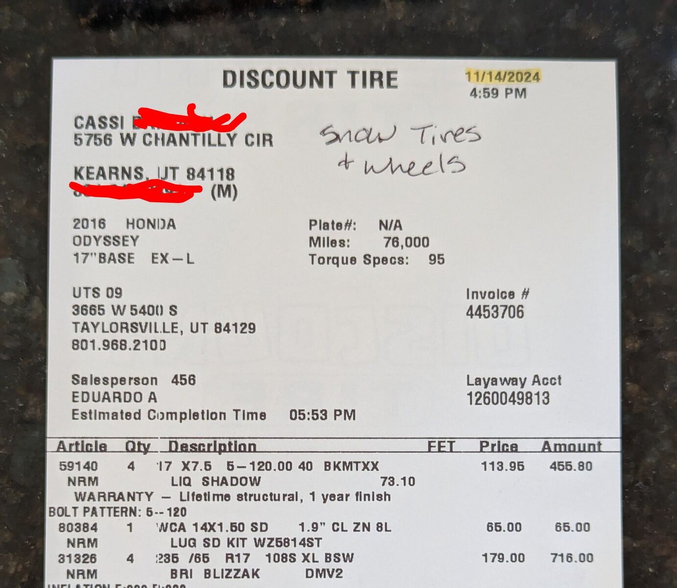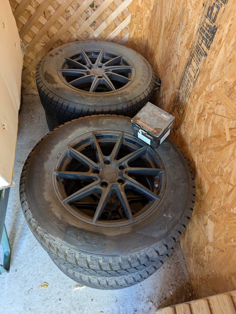 VenmoSet of 4 snow tires and rims, practically brand new. Tires are Bridgestone Blizzak 235/65 R17. Wheels are LiquidMetal. Only used one season (winter of '24/'25; tires were removed in spring) with light driving (maybe 1,000 miles). We bought them Nov 2024, but ended up getting a new vehicle Nov 2025, and they don't fit anymore. They were stored in a garden shed, out of the sun and weather. Comes with lug nuts. Total price I paid was about $1,200.