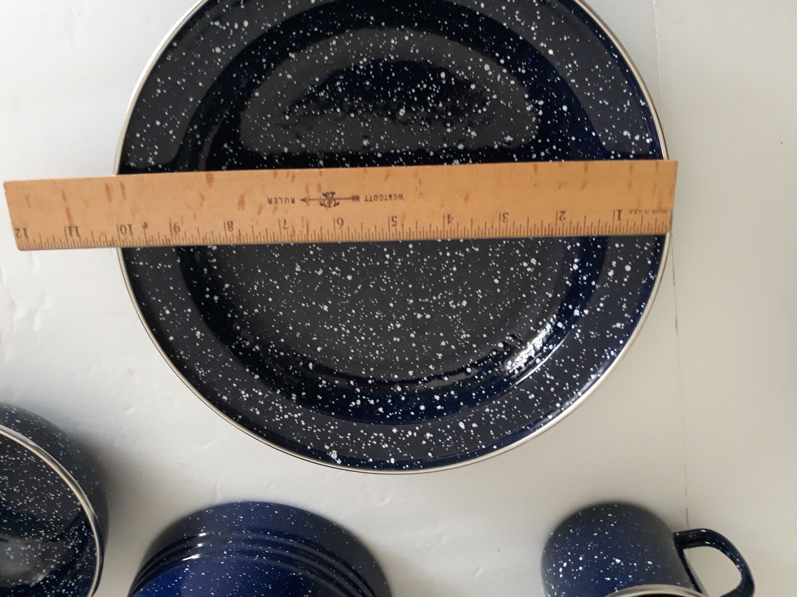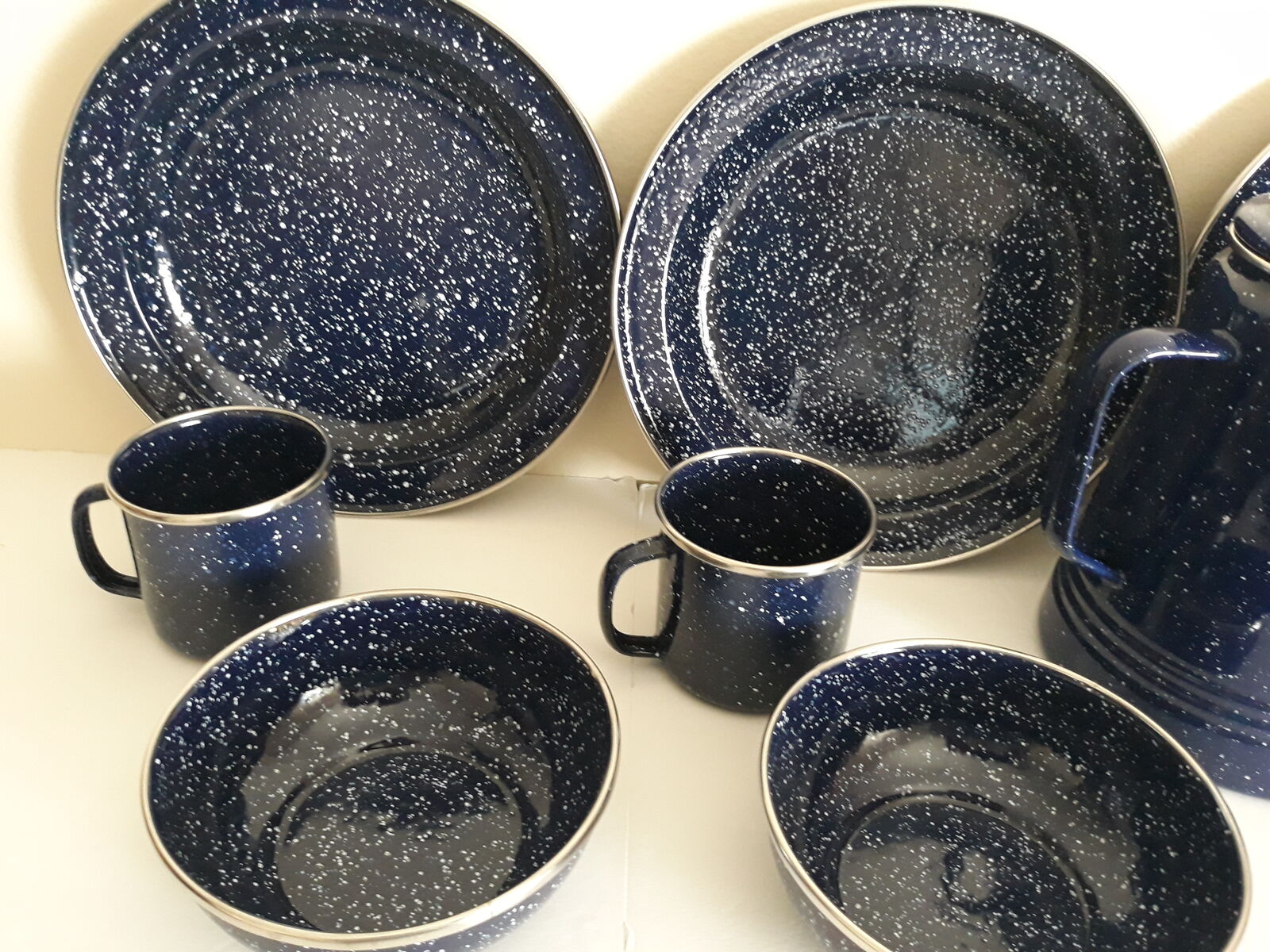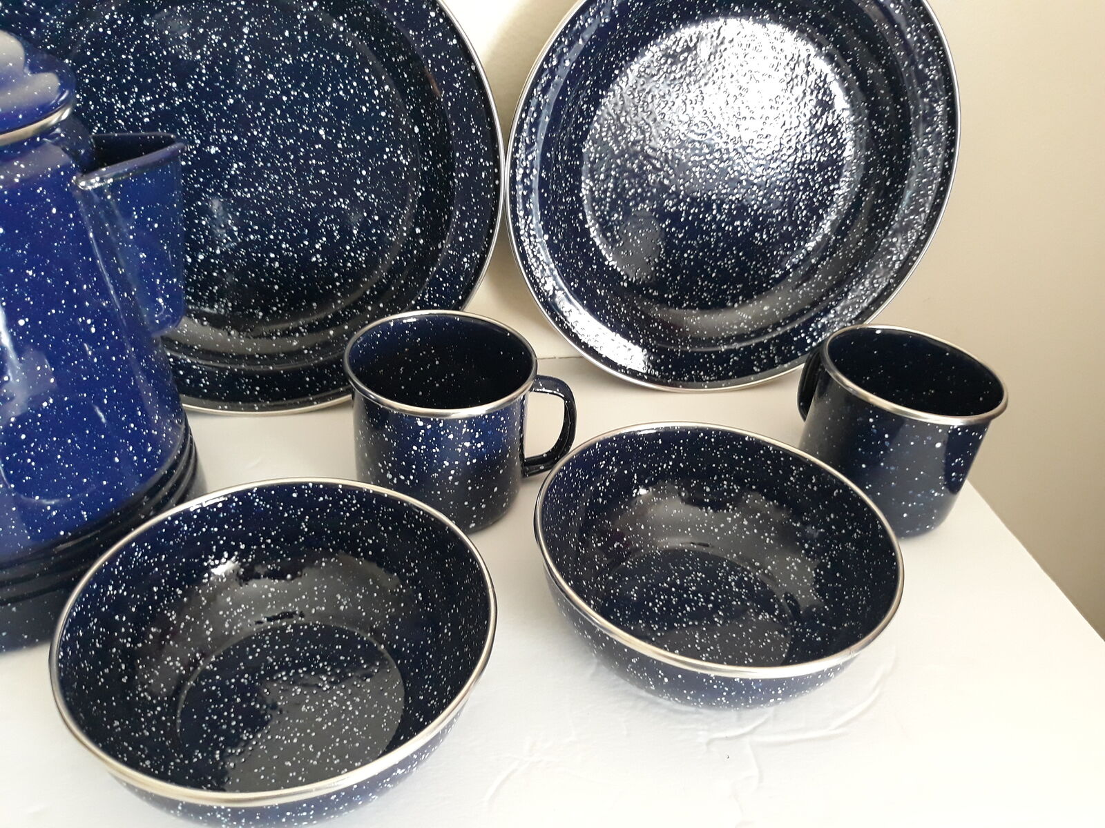 This is a very nice set of heavy duty blue speckled enamelware. There is service for four. The kettle is a slightly lighter blue than the other dishes, not sure why. Everything has a nice silver colored trim. Everything is like new except for one of the plates has a scratch, see pic. Phone calls or texts please. Cash only. Thanks for looking!