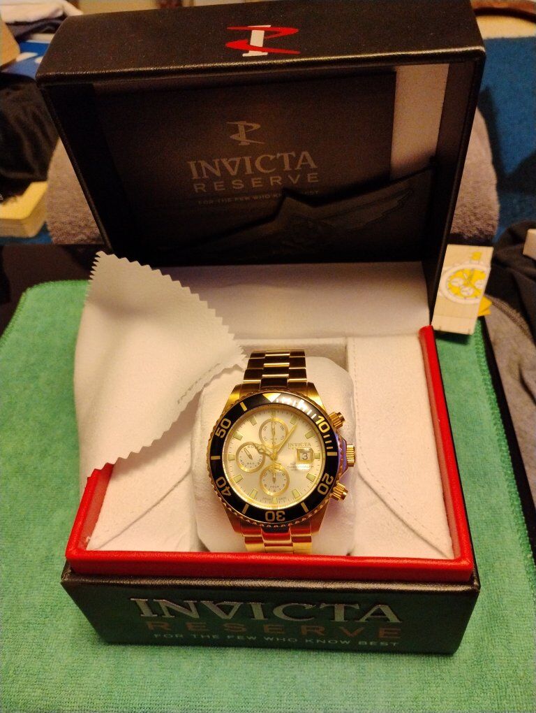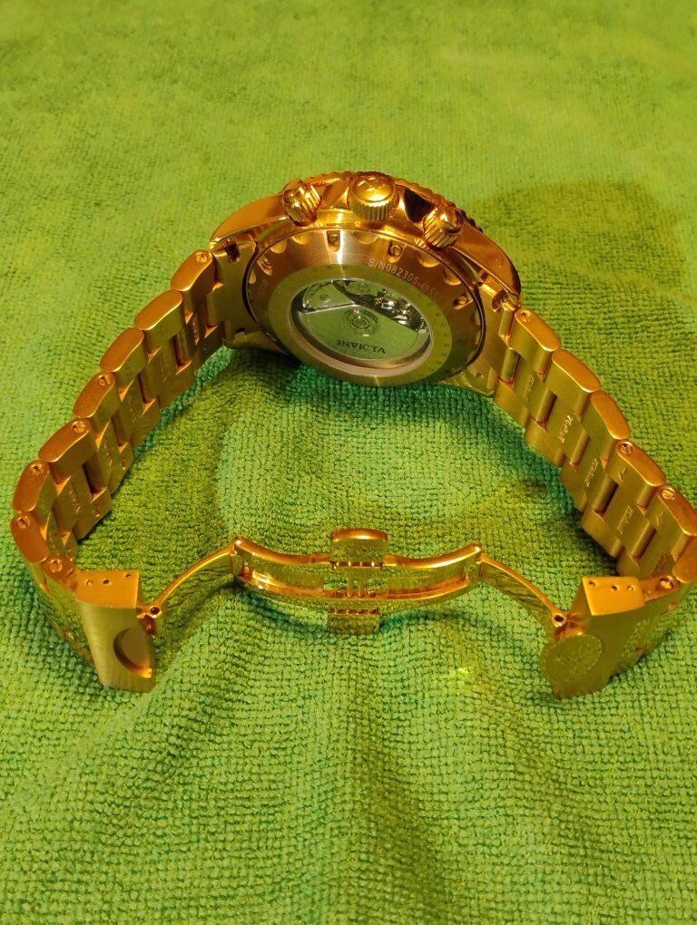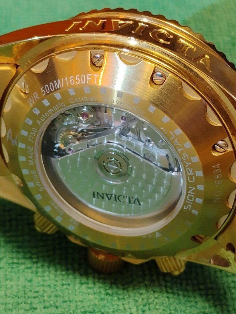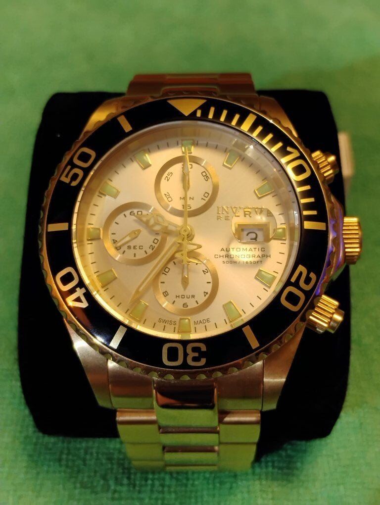 Invicta Reserve Swiss Made Automatic Chronograph Watch. Model number 6894, 46mm case size, Excellent condition! Decorated Swiss Made Valjoux 7750- 25-jewel automatic chronograph 3 hand date movement, hours, minutes, seconds subdials. 24K swiss gold layering over 316-L stainless steel case and bracelet. Flame fusion crystals, Uni directional divers bezel, screw down crowns, water resistant 500 meters (1650 feet), dual deployent clasp. Comes with box and papers. Serious buyers only please.