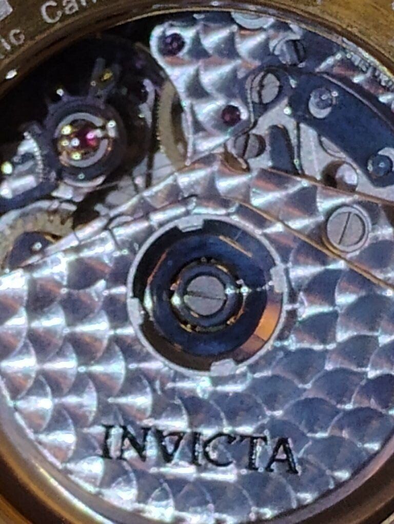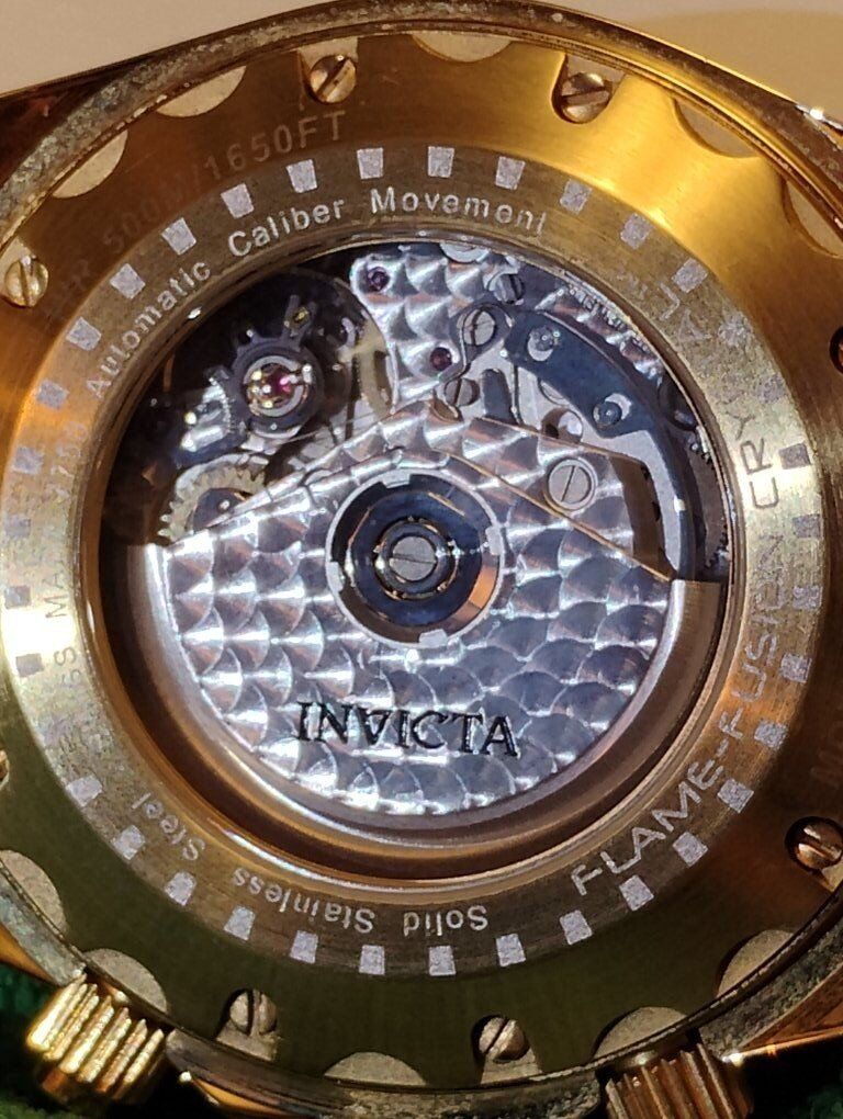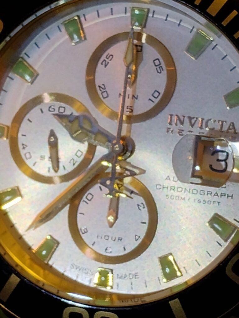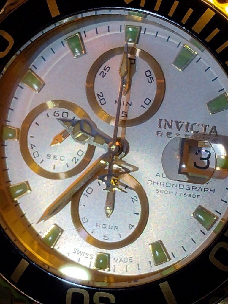 Invicta Reserve Swiss Made Automatic Chronograph Watch. Model number 6894, 46mm case size, Excellent condition! Decorated Swiss Made Valjoux 7750- 25-jewel automatic chronograph 3 hand date movement, hours, minutes, seconds subdials. 24K swiss gold layering over 316-L stainless steel case and bracelet. Flame fusion crystals, Uni directional divers bezel, screw down crowns, water resistant 500 meters (1650 feet), dual deployent clasp. Comes with box and papers. Serious buyers only please.