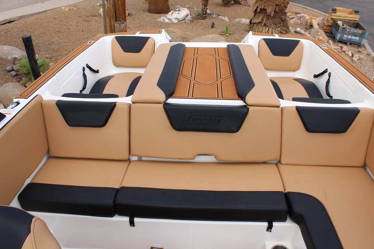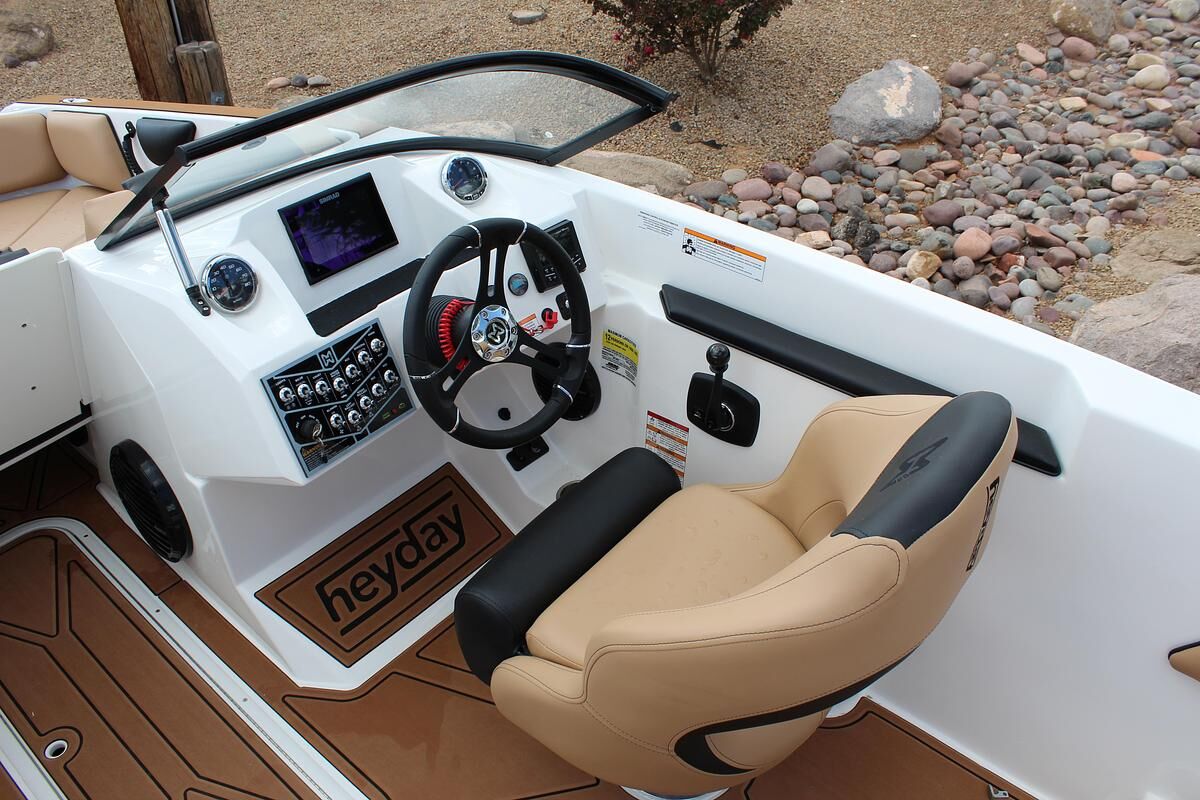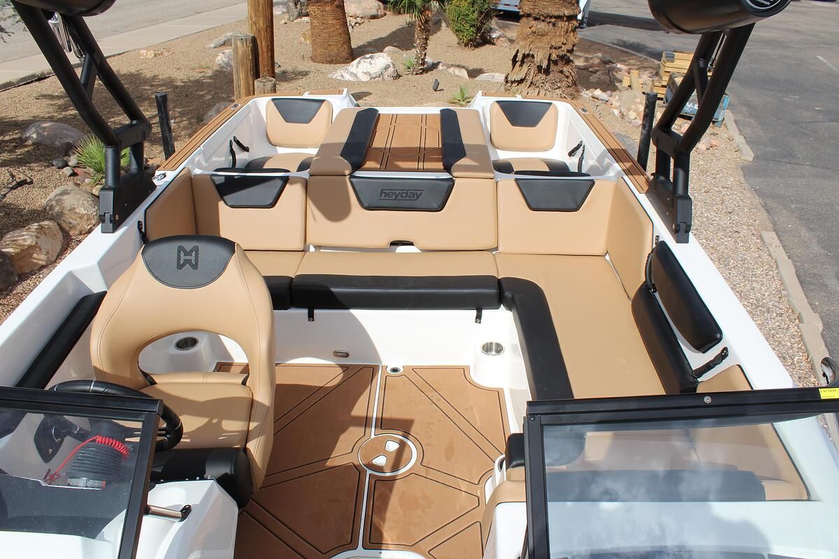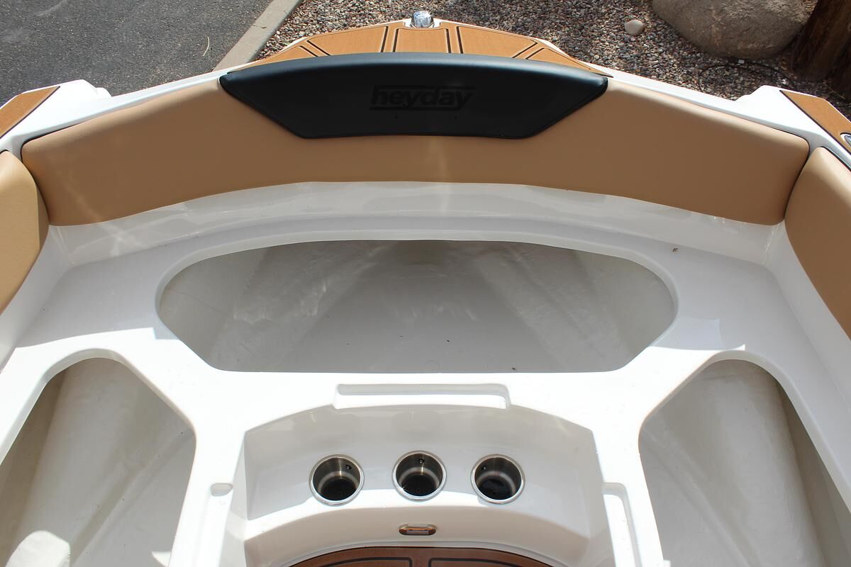 The WT-2DC offers a dual console layout with full windshield and wraparound cockpit seating. This model features a walkthrough to the swim platform with a transom step for getting ready between rides. There’s plenty of storage thanks to a spacious ski locker and under seat base storage. And of course, it has Heyday’s signature ‘Heyday Hangout Zone’ seats that get passengers closer to the action and conceal even more storage below