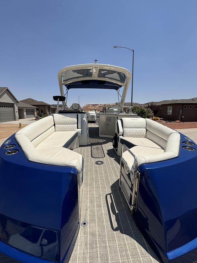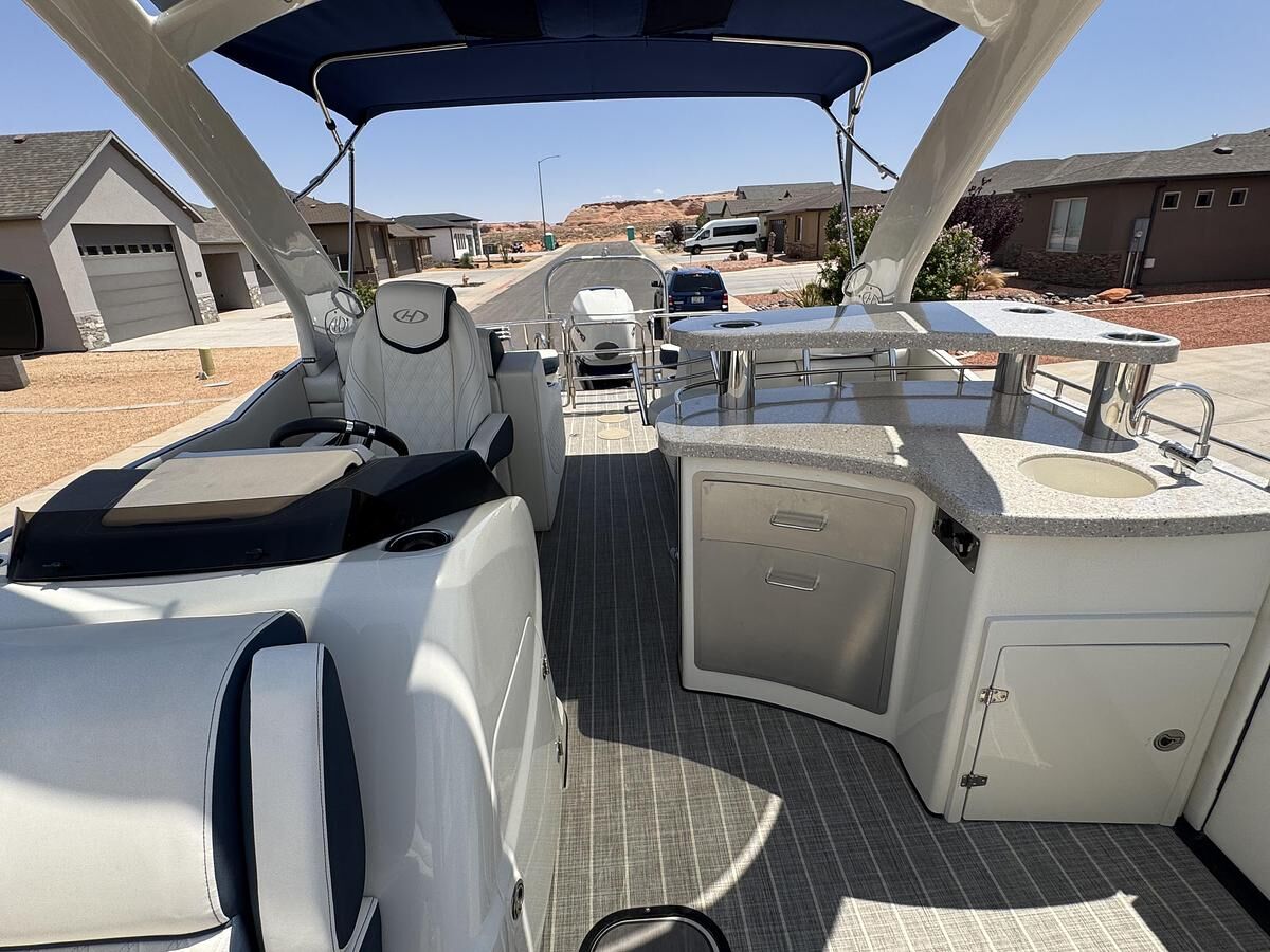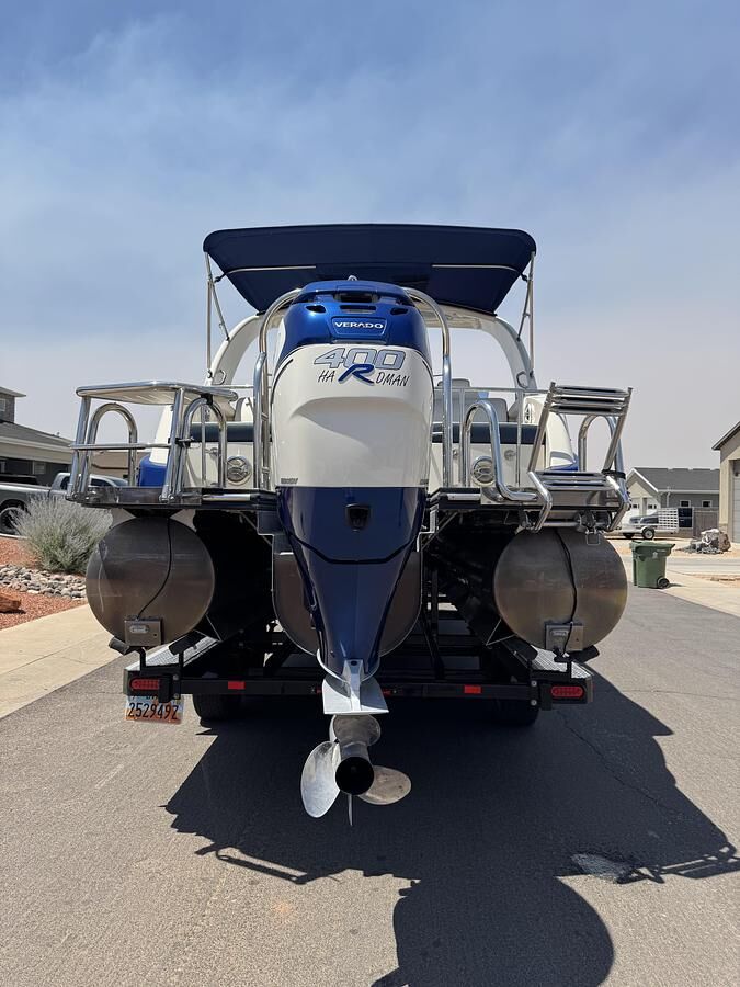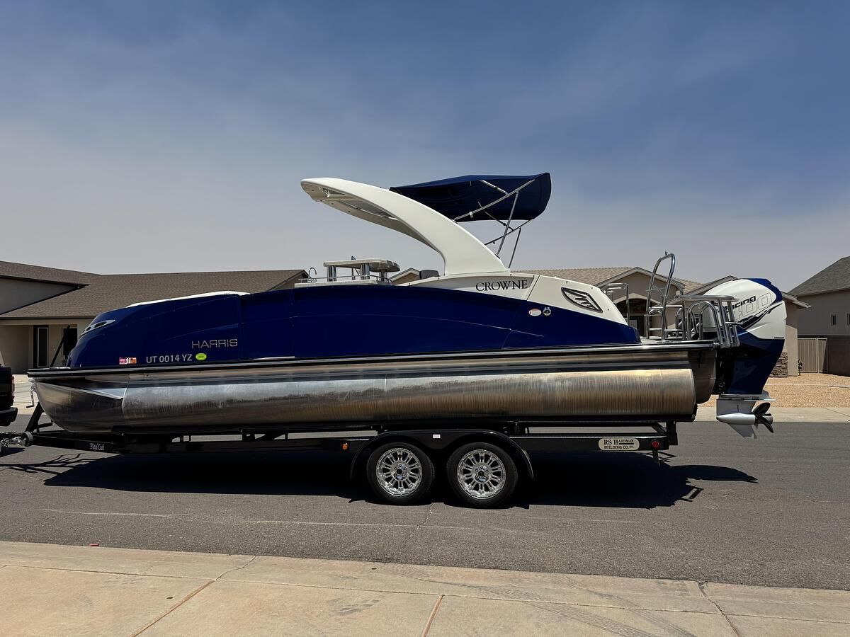 2018 Harris Pontoon 250 DL This triple pontoon brings comfort and power together with it's plush interior and Mercury's 400 R outboard (color matched cowling). Offering Simrad display, premium sound system, wet bar with sink, chrome railing, power ladder, dual battery switch, center floor storage compartment, power arch, tandem axle powder coated trailer, with stylish wheels, low hours, and much much more.