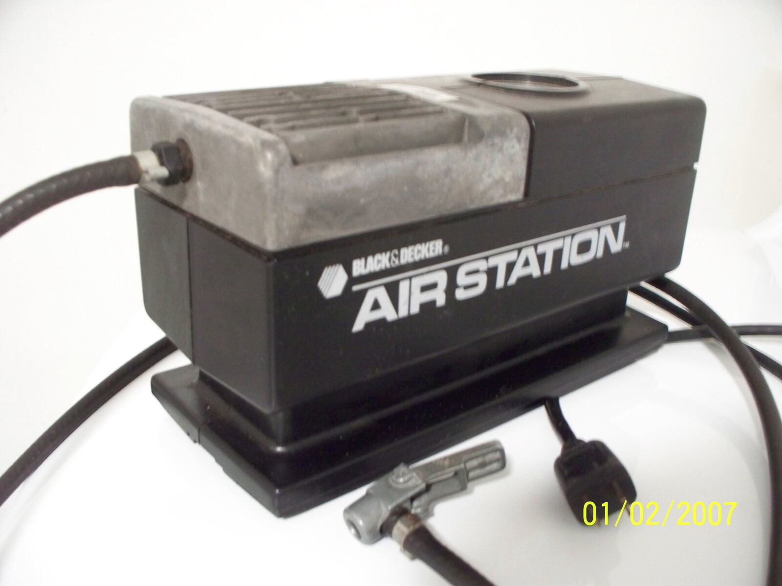 Black & Decker model 9527. High pressure, 60-150 PSI B & D air pump powered by AC wall outlet. 6 foot heavy duty rubber hose ends in standard car or bike tire plug. Pressure gauge shows PSI. Works great: for a demo, email or phone 801 487-3047