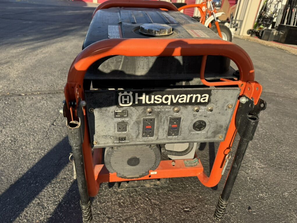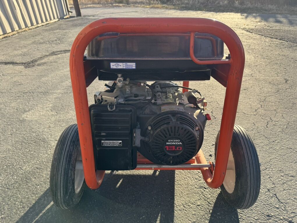 ZelleA whole house or job site portable generator with 6500 running watts and 8125 surge watts, featuring a 7-gallon fuel tank for long runtimes, automatic voltage regulation, and safety features like low oil shutdown and GFCI outlets. It is equipped with a commercial-grade Honda engine and comes with a sturdy frame, fold down handles, and pneumatic tires for easy transport. 228hrs old