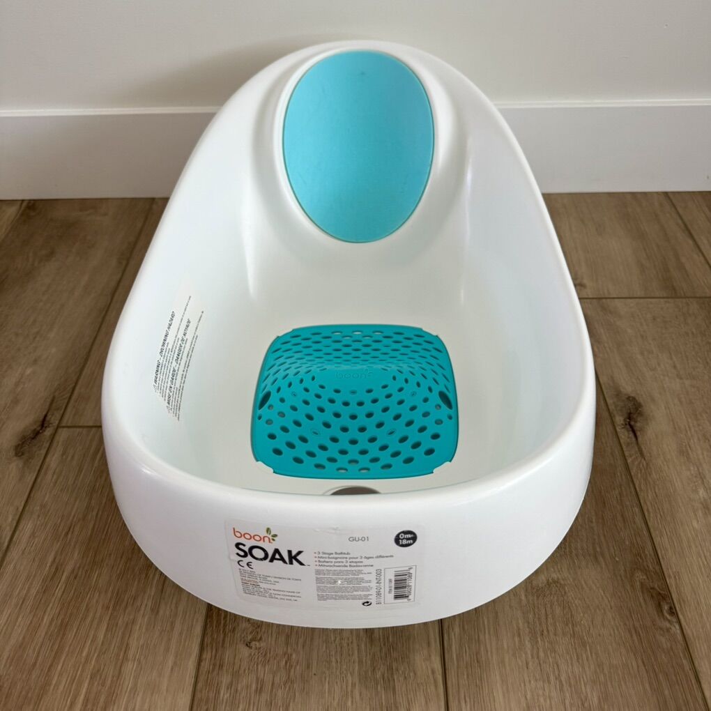 Item Description: This gently used Boon Soak 3-Stage Baby Bathtub is in great condition and has been well cared for. It’s designed for babies from 0 to 18 months (newborn through toddler) and grows with your little one through three stages. Features include an adjustable “bump” to position baby as they grow, a contoured back wall with non-slip foam for safe bathtime, and a color-changing drain plug that helps you gauge the ideal bath water temperature. It fits in most double sinks or full size bathtubs for flexible use.