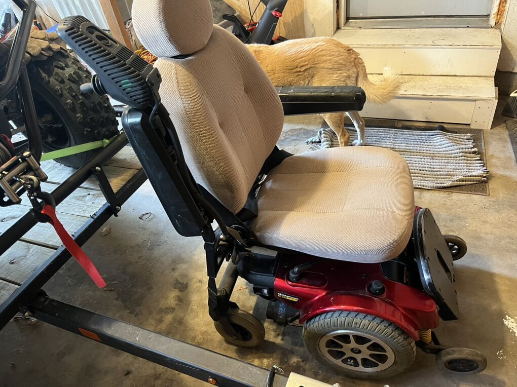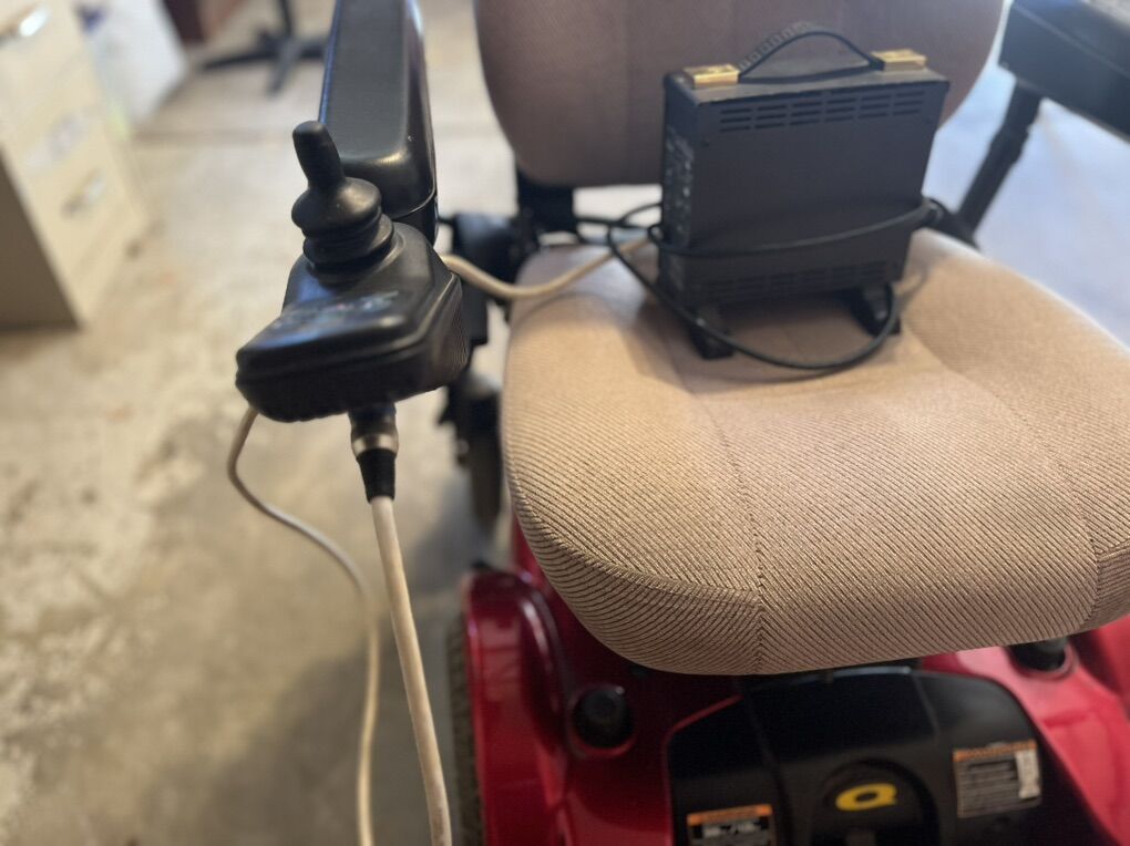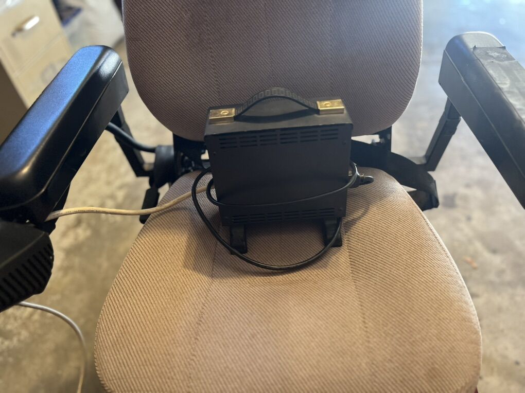 Quantum 1121 Power Chair. Newer Batteries. Seat raises and lowers to different heights. Some damage to left arm rest. Great for road travel. Different speeds to get you around at a slower pace or faster like a drag car to get you there in a hurry. Easy connect charger.