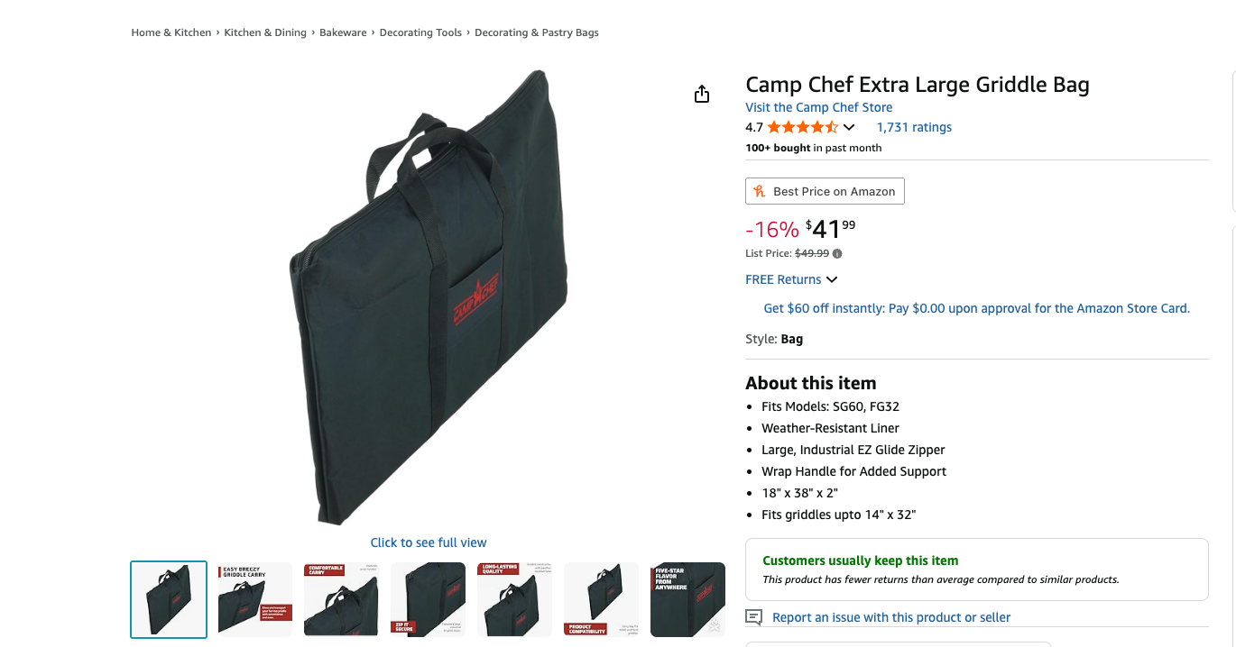 Camp Chef Griddle Carry Bag for griddles up to 14 x 32 inches. Fits Models SG60, FG26, FG32 and BS60C. Bag Dimensions are 38 x 18 inches.