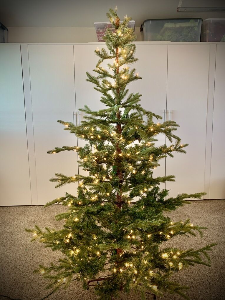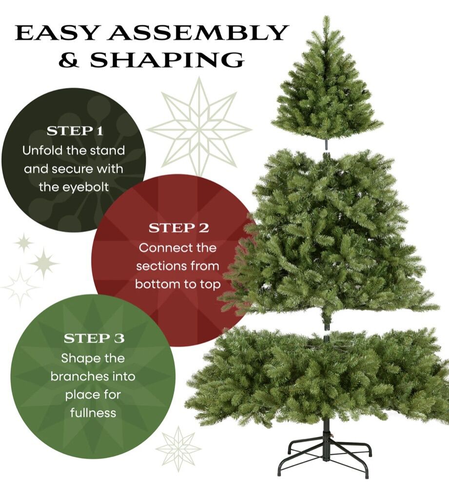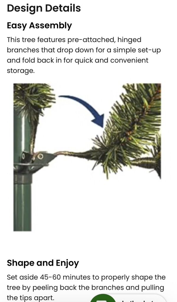 This tree features pre-attached, hinged branches that drop down for a simple set-up and fold back in for quick and convenient storage. Properly shape the tree by peeling back the branches and pulling the tips apart.