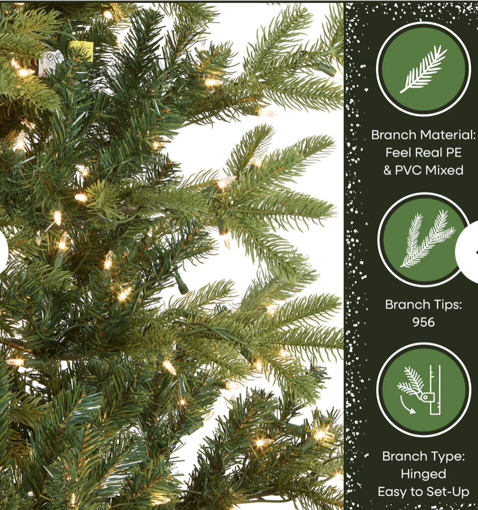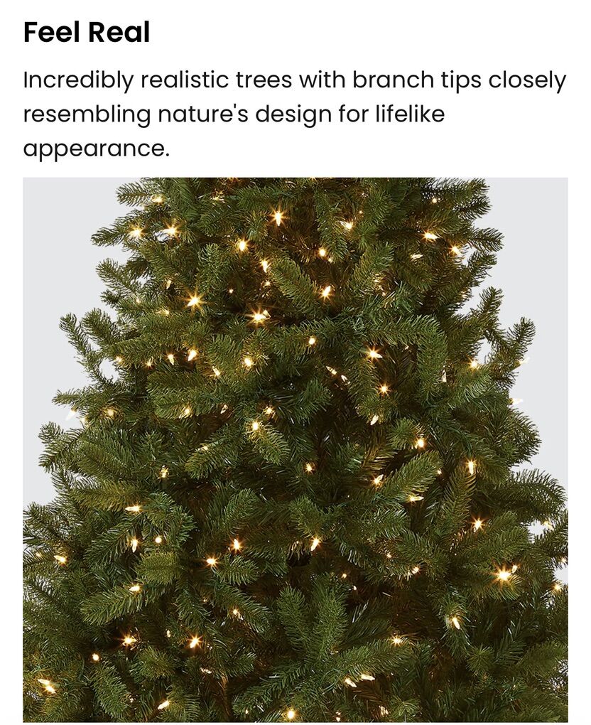 This Norwegian Spruce tree features Feel Real branch tip technology, creating a tree with remarkable realism. These crush-resistant branch tips are molded from real tree branches for an authentic living tree appearance. This tree has a traditional cone shape with upswept branch design and is pre-strung with 650 clear lights that remain lit even if a bulb burns out. This tree features hinged branch construction for ease of assembly. Sturdy metal tree stand is included.