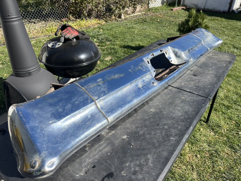 Front and Rear Chrome Bumpers. Front bumper is 78” long and mounting brackets are 38” apart. Rear bumper is 75” long and mounting brackets are 50” apart. Crome is actually in pretty good shape. No pitting. Definitely could use a buff and polish treatment to make them shine. They are super heavy.