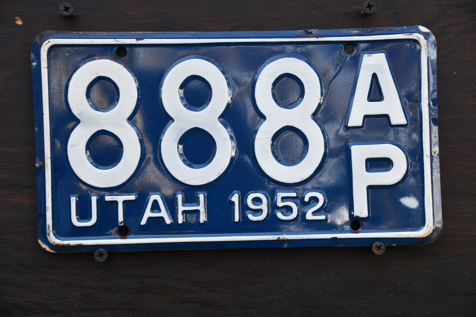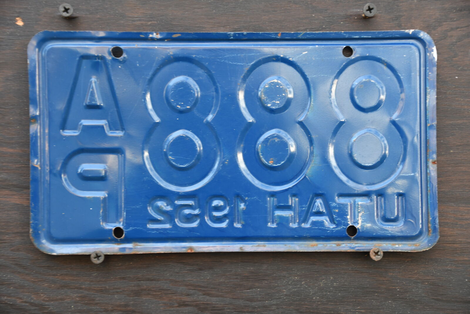 Utah 1952 Original License Plate. #888 AP. Utah only made a single plate for 1952, no pairs were made. Very nice number on an excellent plate. Cash only in Plain City. We don't have Venmo.