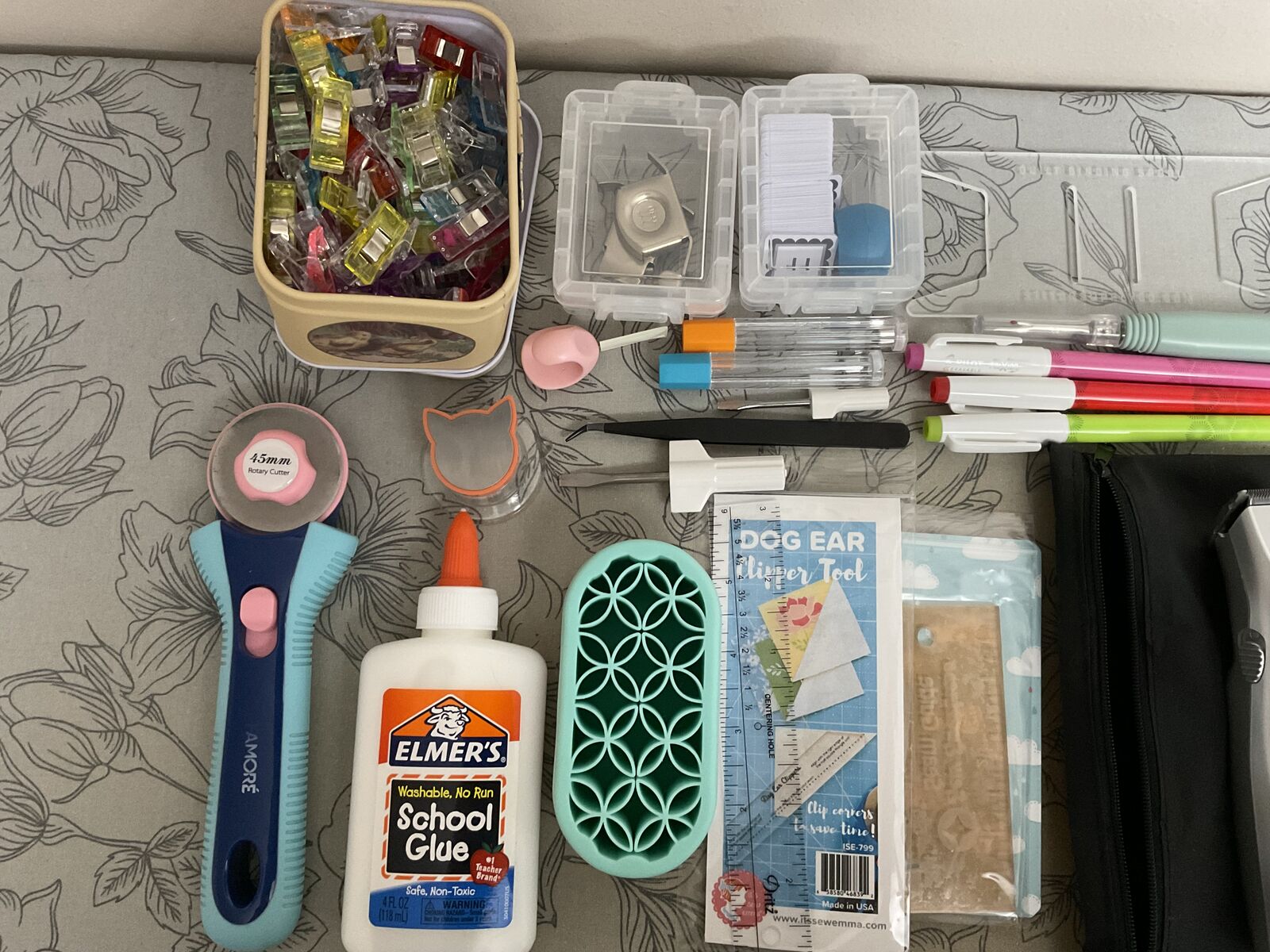 This lot is composed of various quilting notions. I'm selling this as one lot and NOT individually. Here is a list of what is included: Wahl mini shaver that I used to rip long seams, tin box of clips, Famore 45mm rotary cutter, Lori Holt letters and numbers stickers, magnetic seam guides, light up seam ripper, alpha bitties from fat quarters shop, frixion markers, binding spools from stitch fabric co, and more.