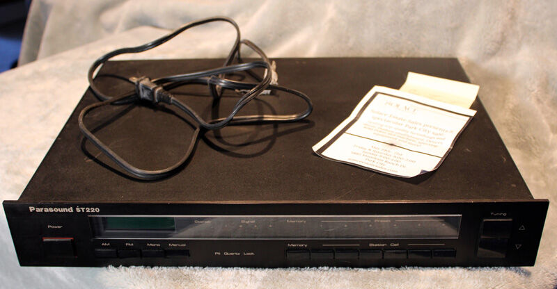VenmoA beautiful, vintage Parasound ST220 Stereo AM/FM Tuner. This tuner was purchased as/is from the estate sale of the legendary audio designer, Jim Fosgate. It powers on, but I can't get a signal out of it. This model is likely from the 1990s.