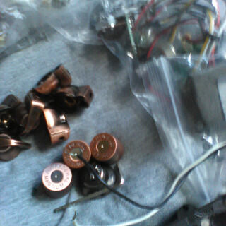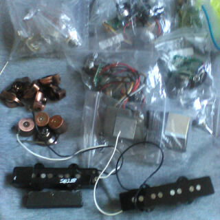 *****I had this stuff explicitly described, but the link disappeared....Half what I paid. In brief, (1) Three Artec preamps and eq circuits with new jacks: 2 SE-3, 1 QTA, (2) Fender Jazz pickup pair from a 2010s-era Geddy Lee jazz, (3) Bronze/aged copper knobs, 6 plastic chickenhead and 3 metal bulletshell from Guyker (4) Five Ernie Ball red-ribbon patch cables: 2 3", 2 6", 1 12". (5) 2.5ft. of 2" wide heavy black velcro tape, plus a roll of copper shielding tape and new 80/20 silver solder.