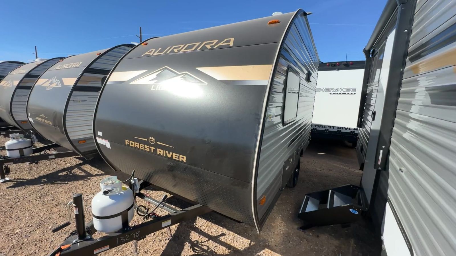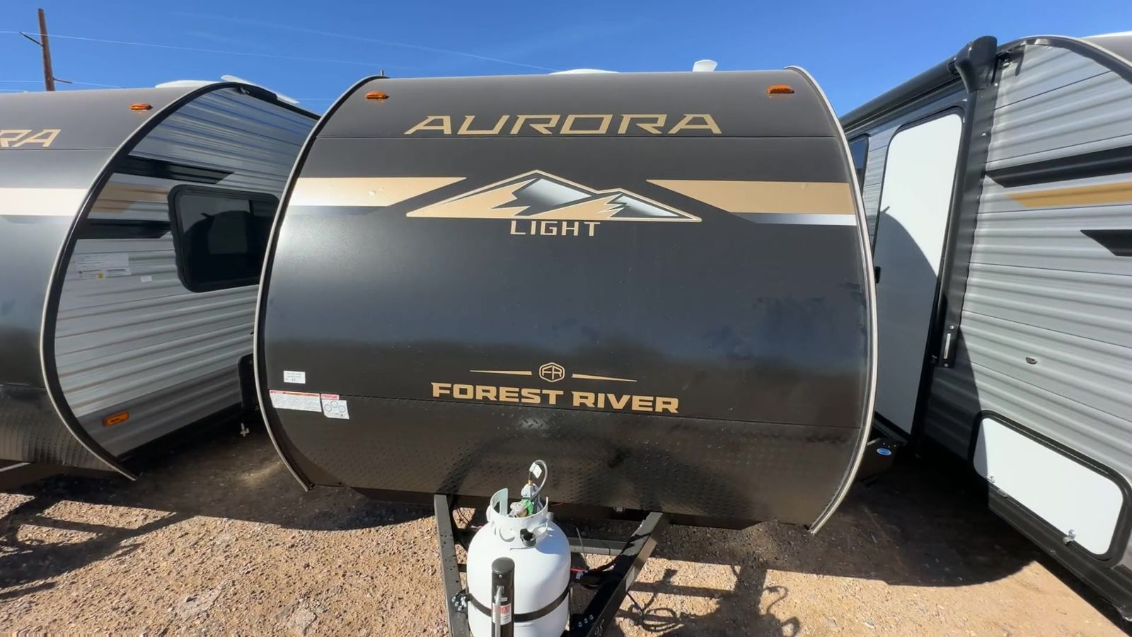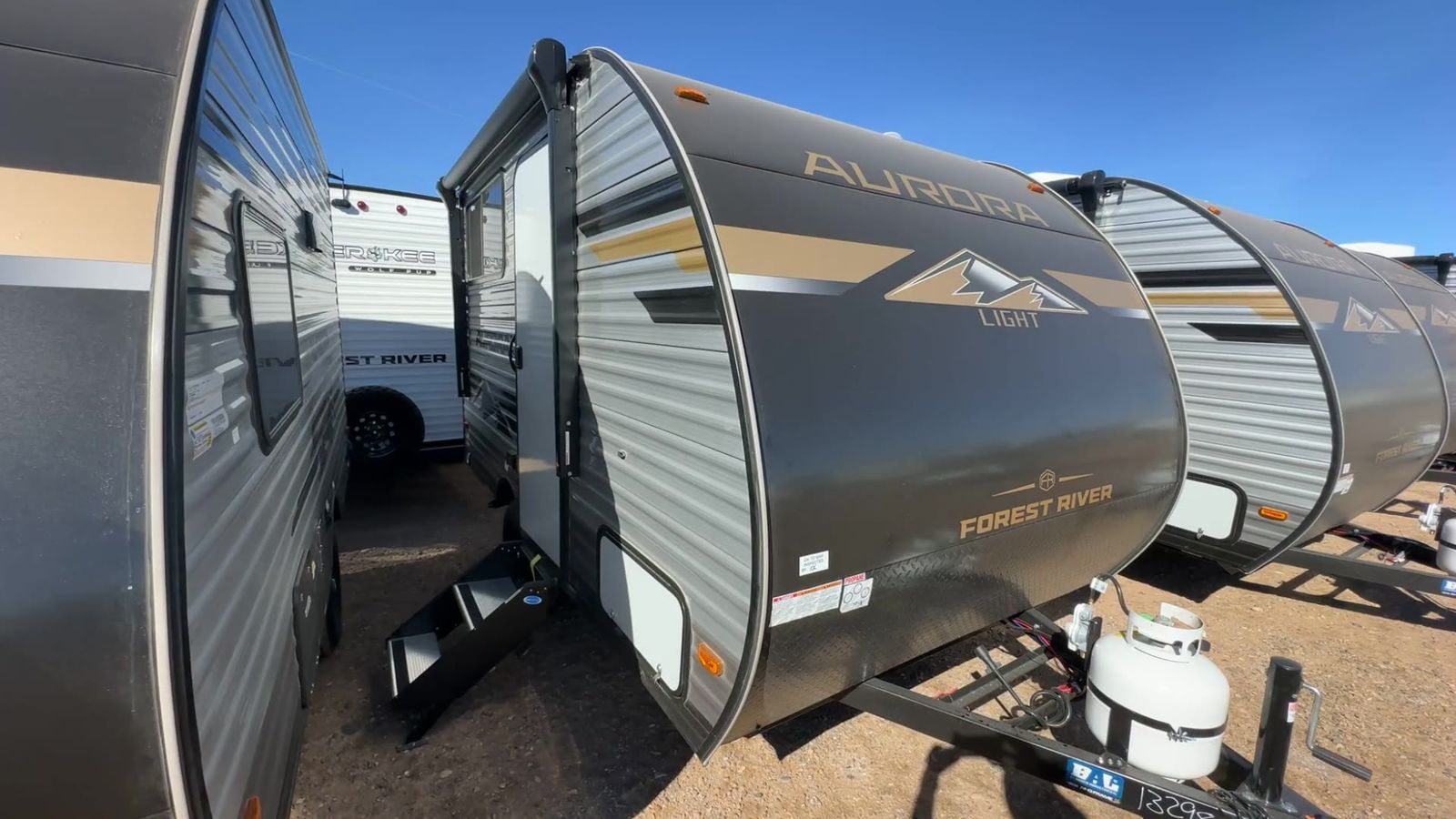 Forest River Aurora Light travel trailer 13BHX highlights: 54" x 74" Queen Bed Two Burner Gas Range Sleeps Four Exterior Storage This lightweight travel trailer includes everything you need for comfortable camping trips at the lake. You can make your meals on the two burner cooktop or in the stainless steel microwave, and a 3.3 cu. ft. 12V refrigerator will keep leftovers fresh. A front queen bed provides a great night's rest, and there are 29" x 70" bunk beds for your guests or little ones. And a private bath with a 24" x 32" shower and toilet will let you easily freshen up without having to use the camp's facilities! Comfortability, usability, and quality is what you will find in each one of these Forest River Aurora Light travel trailers! They are designed with a superior build and packed full with industry leading, functional, and distinctive standard features. The diamond plate rock guard will protect your unit from road debris and the nitrogen filled radial tires, which keep their pressure longer, offer better fuel economy. You will also find upgraded JBL Elite exterior speaker outside, an electric awning with multicolor lights and remote, plus flush mount baggage doors for easy packing. The interiors are beautifully designed with matte black kitchen and bath faucets, black nightshades in the living room, and GE kitchen appliances!