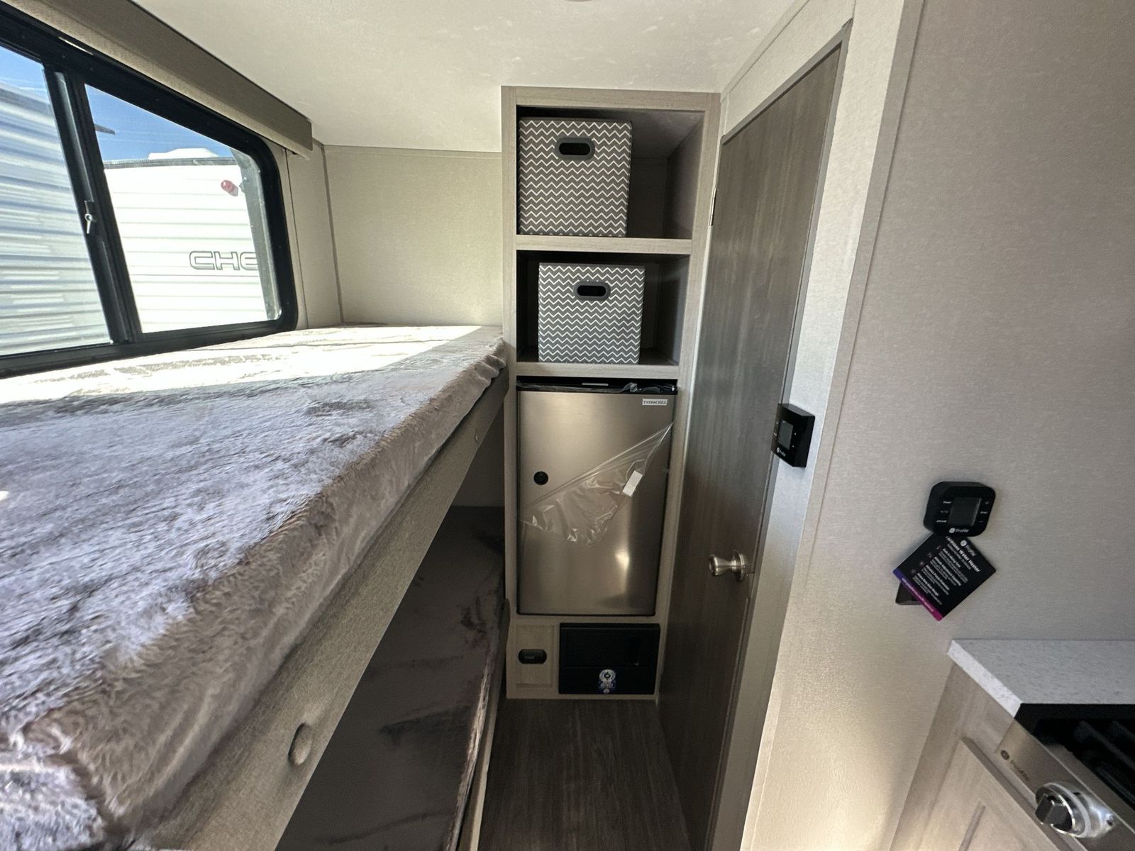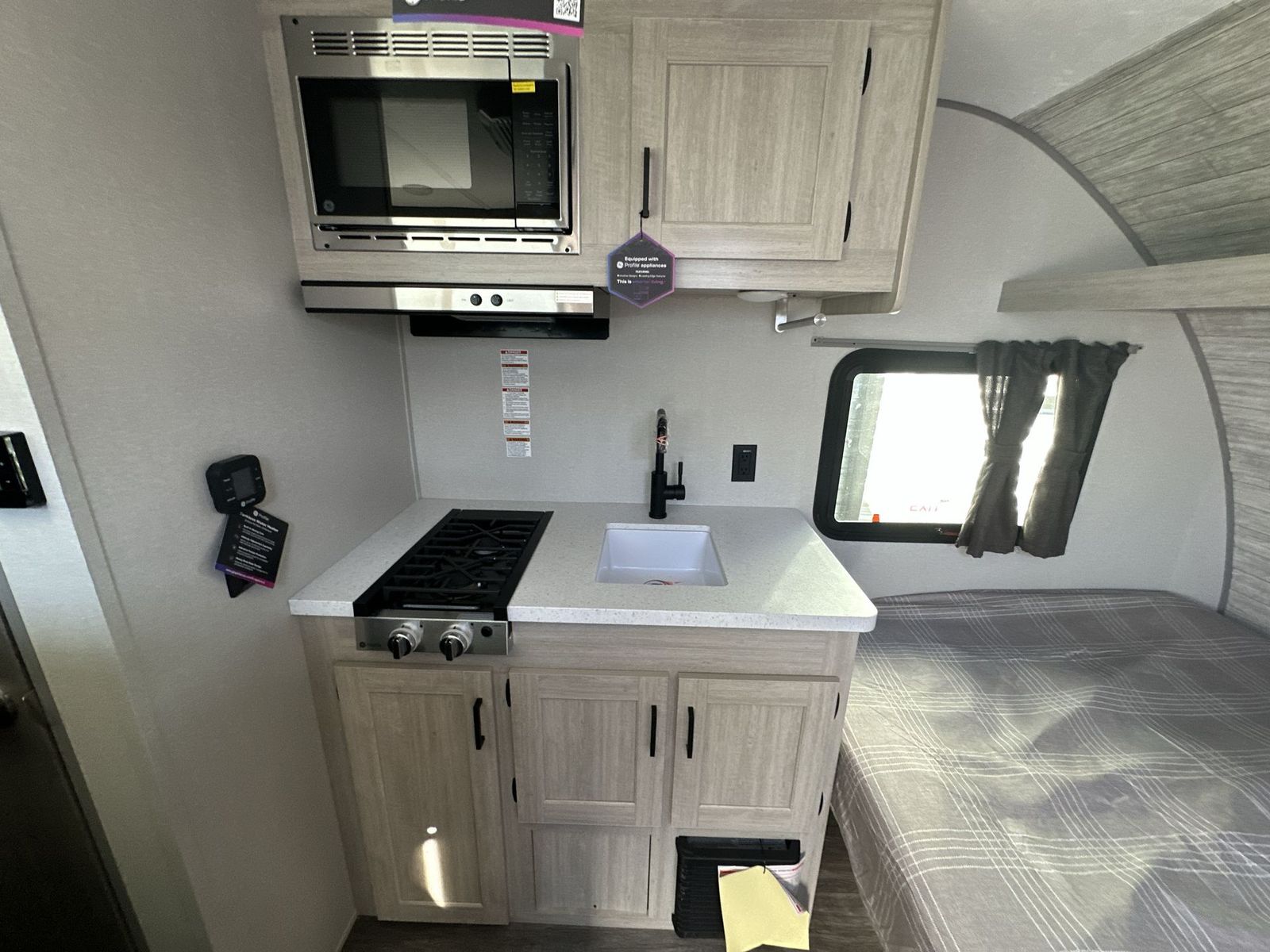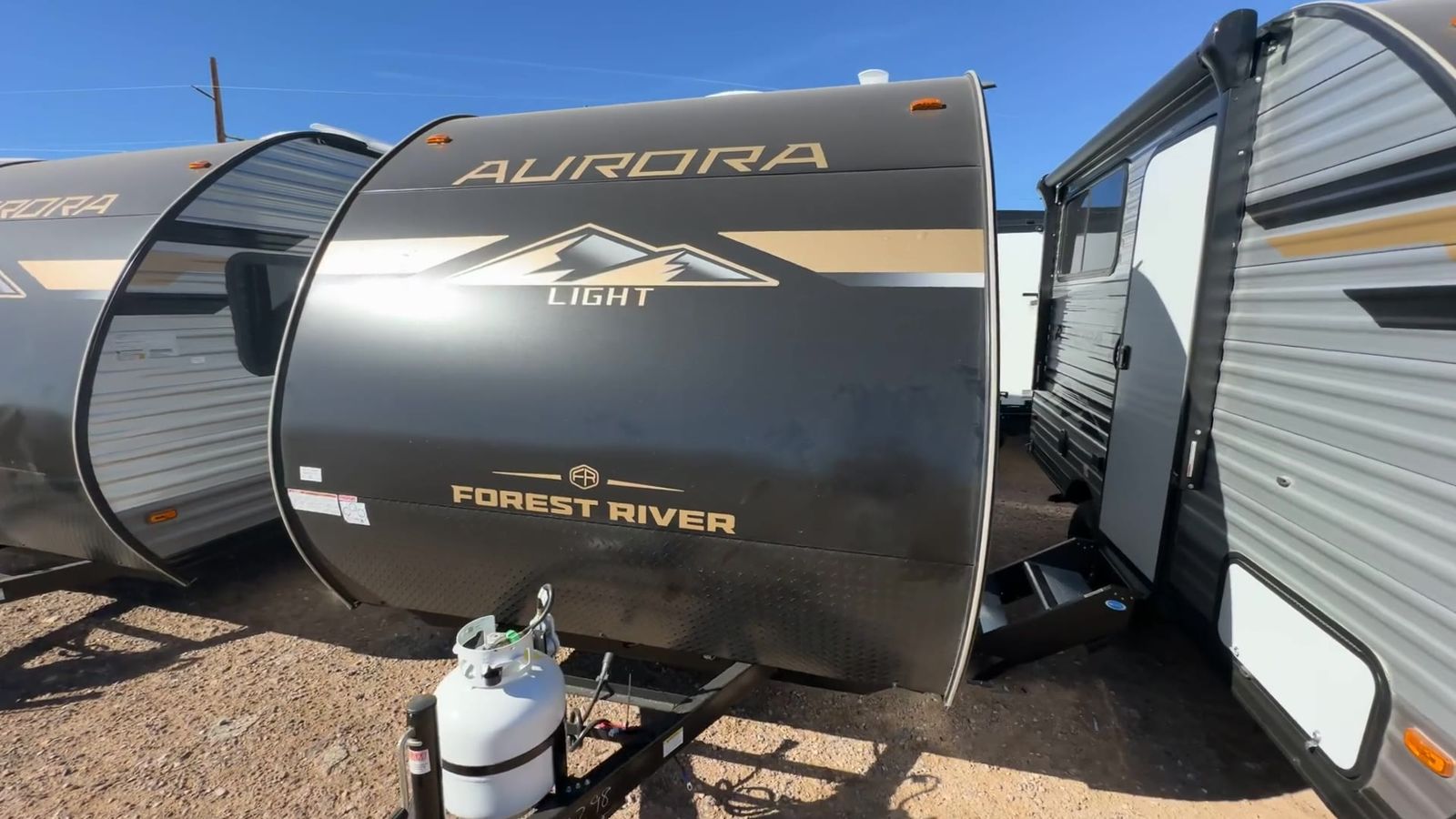 Forest River Aurora Light travel trailer 13BHX highlights: 54" x 74" Queen Bed Two Burner Gas Range Sleeps Four Exterior Storage This lightweight travel trailer includes everything you need for comfortable camping trips at the lake. You can make your meals on the two burner cooktop or in the stainless steel microwave, and a 3.3 cu. ft. 12V refrigerator will keep leftovers fresh. A front queen bed provides a great night's rest, and there are 29" x 70" bunk beds for your guests or little ones. And a private bath with a 24" x 32" shower and toilet will let you easily freshen up without having to use the camp's facilities! Comfortability, usability, and quality is what you will find in each one of these Forest River Aurora Light travel trailers! They are designed with a superior build and packed full with industry leading, functional, and distinctive standard features. The diamond plate rock guard will protect your unit from road debris and the nitrogen filled radial tires, which keep their pressure longer, offer better fuel economy. You will also find upgraded JBL Elite exterior speaker outside, an electric awning with multicolor lights and remote, plus flush mount baggage doors for easy packing. The interiors are beautifully designed with matte black kitchen and bath faucets, black nightshades in the living room, and GE kitchen appliances!