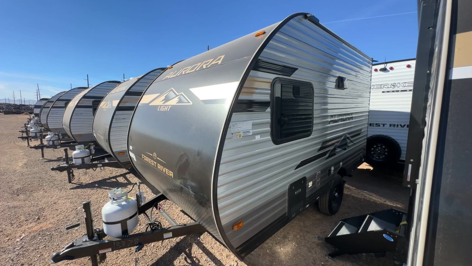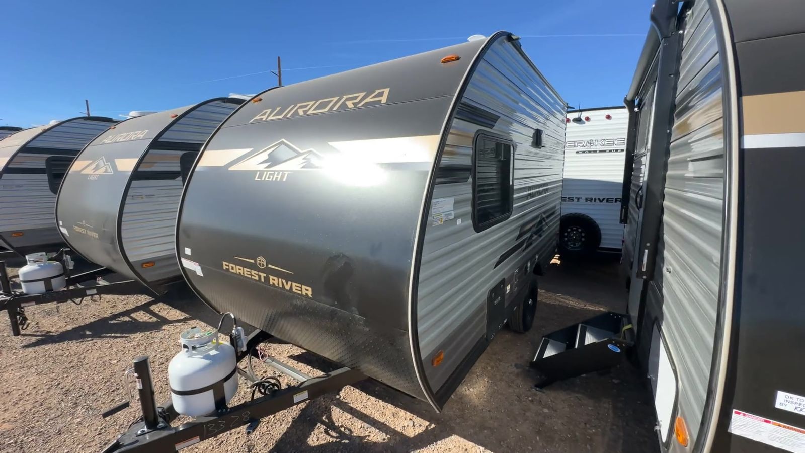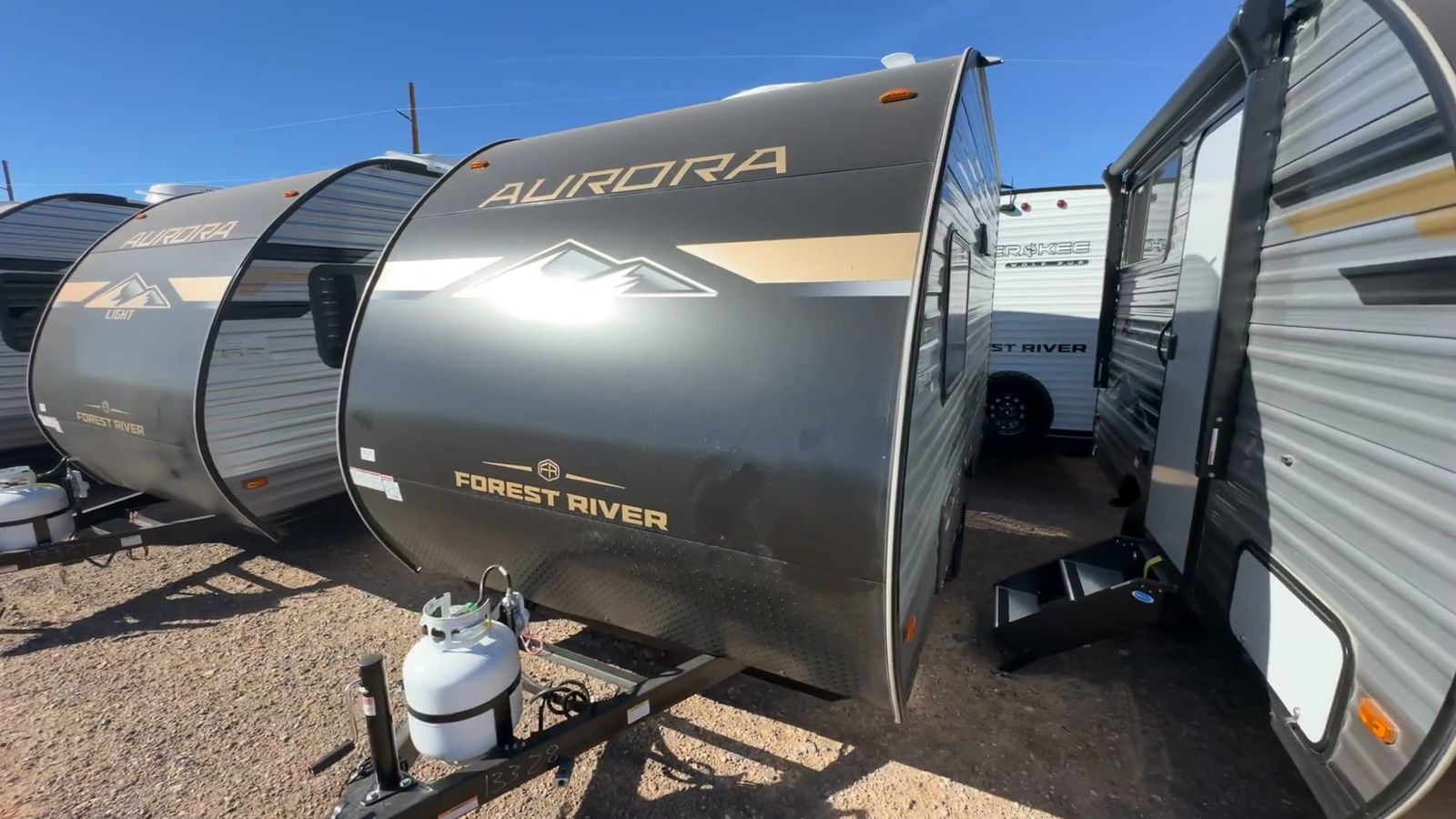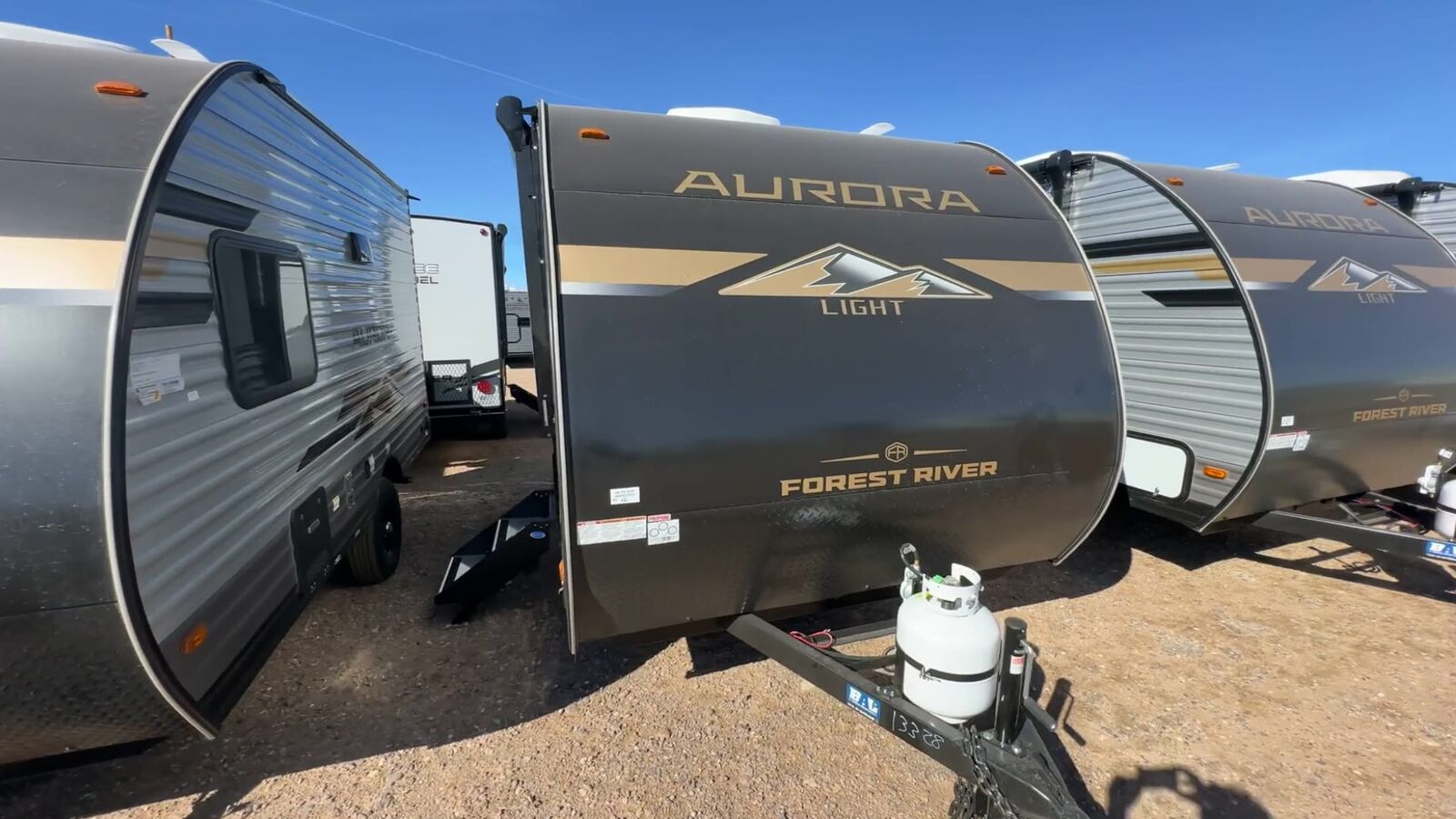 Forest River Aurora Light travel trailer 13RDX highlights: 54" x 74" Queen Bed Two Burner Gas Range Sleeps Three Exterior Storage This lightweight travel trailer includes everything you need for comfortable camping trips at the lake. You can make your meals on the two burner cooktop or in the stainless steel microwave, and a 3.3 cu. ft. 12V refrigerator will keep leftovers fresh. A front queen bed provides a great night's rest, and there is a 29" booth dinette that will double as both dining and additional sleeping space. And a private bath with a 24" x 32" shower and toilet will let you easily freshen up without having to use the camp's facilities! Comfortability, usability, and quality is what you will find in each one of these Forest River Aurora Light travel trailers! They are designed with a superior build and packed full with industry leading, functional, and distinctive standard features. The diamond plate rock guard will protect your unit from road debris and the nitrogen filled radial tires, which keep their pressure longer, offer better fuel economy. You will also find upgraded JBL Elite exterior speaker outside, an electric awning with multicolor lights and remote, plus flush mount baggage doors for easy packing. The interiors are beautifully designed with matte black kitchen and bath faucets, black nightshades in the living room, and GE kitchen appliances!